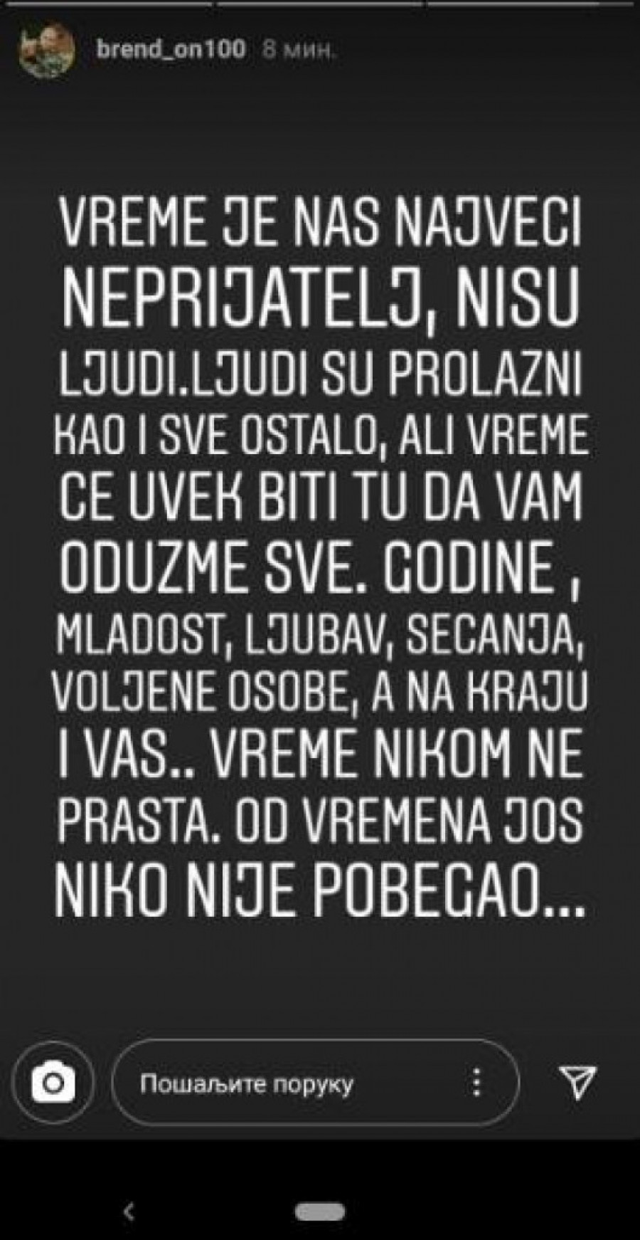 Bivši rijaliti učesnik, Branislav Radonjić, Brendon, oglasio se na svom Instagram storiju, kako bi izneo svoj stav o polaznosti vremena.