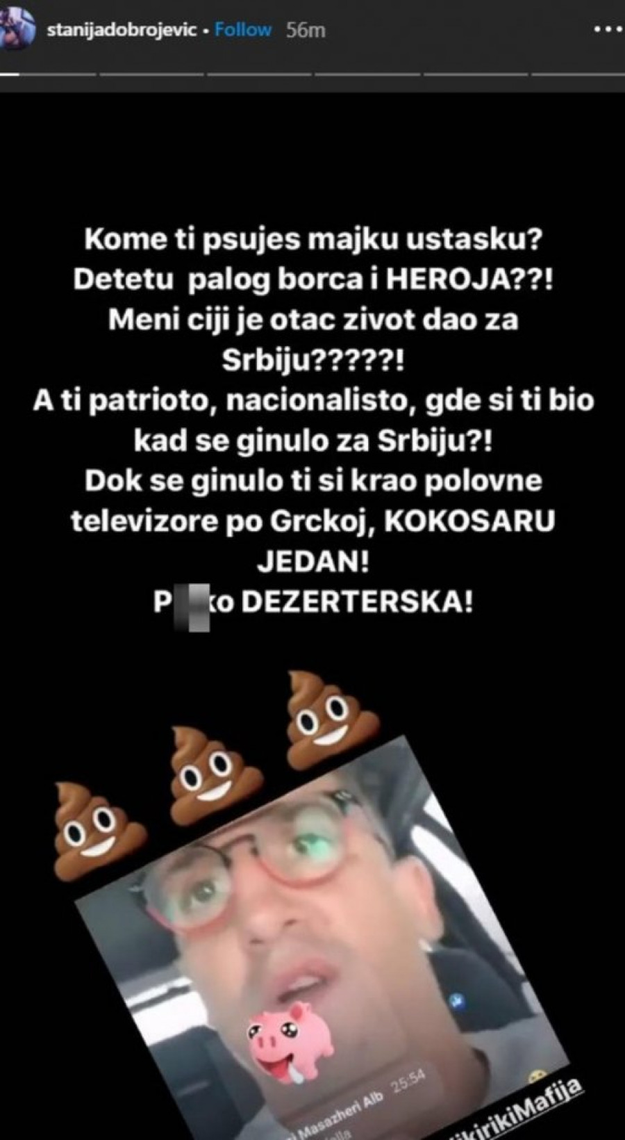 "Kome ti psuješ majku ust*šku? Detetu palog borca i heroja? Meni čiji je otac dao život za Srbiju? A ti, patrioto, nacionalisto, gde si bio kada se ginulo za Srbiju? Dok se ginulo ti si krao polovne televizore po Grčkoj, kokošaru jedan! P*čko dezerterska", napisala je Dobrojevićeva.
