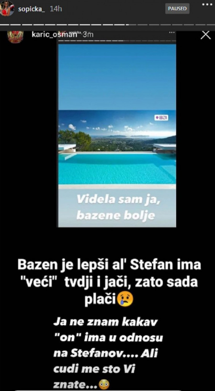Nedavno je Osman na svom Instagarmu napisao kako se zbog Šopićeve u svojoj kući osećao kao gost, verovatno aludirajući na to da se konstantno baškariča u njihovom bazenu, a potom je Ivana objavila fotografiju sa letovanja na Ibici, gde je uživala u bazenu sa prelepim pogledom.