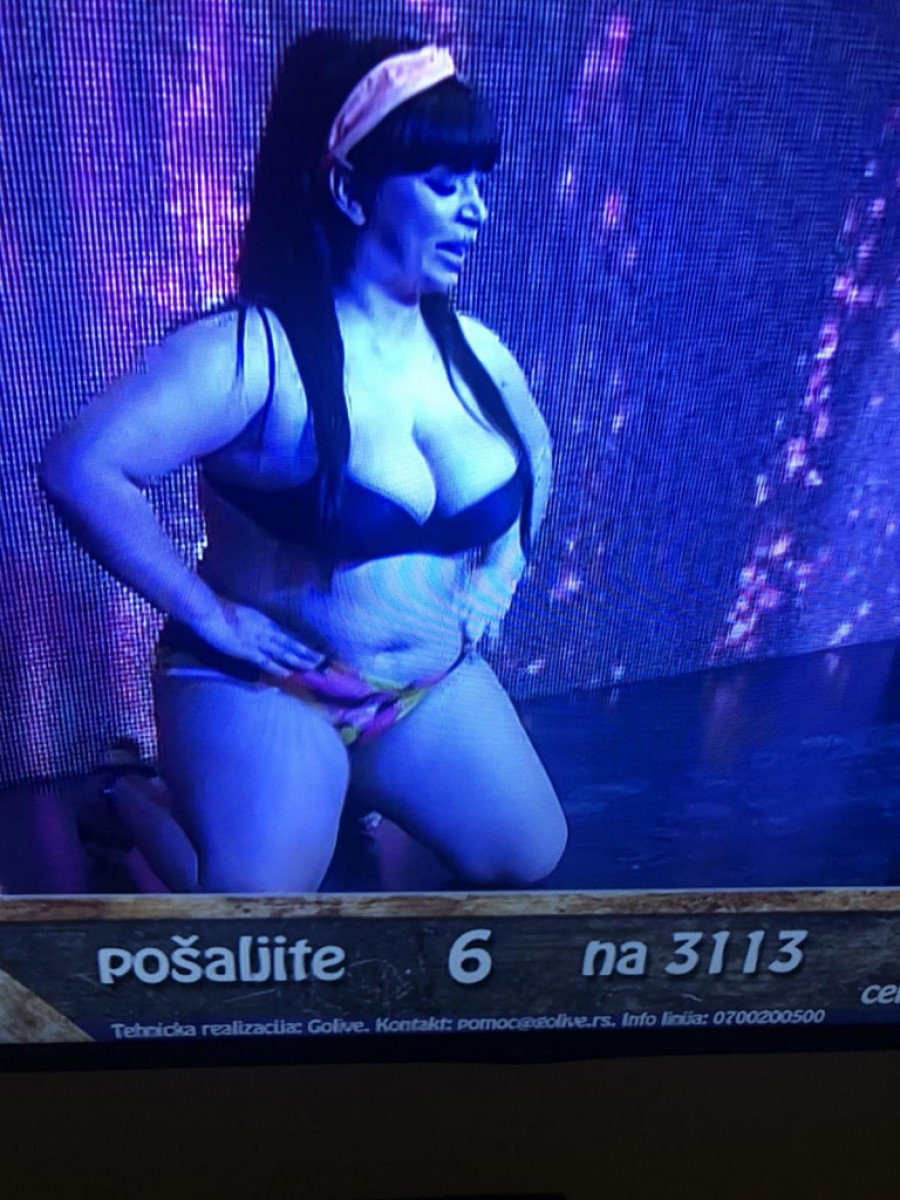 Foto: youtube.com/Zadruga OfficialIako u prvom trenutku nije želela da se skine u kupaći, ipak je na kraju odlučila da to učini, te je bez blama i nikad deblja priredila performans tokom kog su se salo, stomak i celulit prelivali od težine. Pored toga, njoj su i bujne grudi ispadale, a mnogi zadrugari su aplaudirali tokom njenog nastupa jer su smatrali da je hrabra što je pokazala predebelo telo.