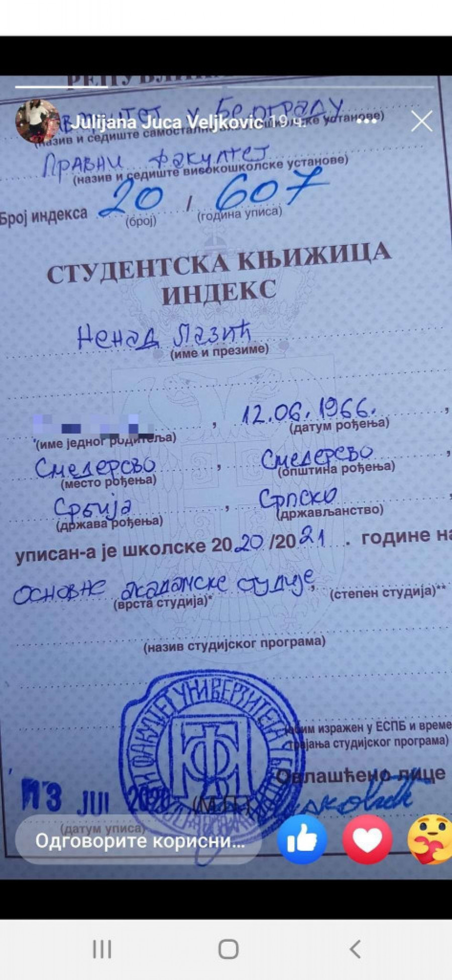 Konačno je isplivala fotka koja je sve dokazala. Slika indeksa sa Necinim imenom kao studentom Pravnog fakulteta verujemo da će mnoge koji su ga osporavali ostaviti bez teksta.