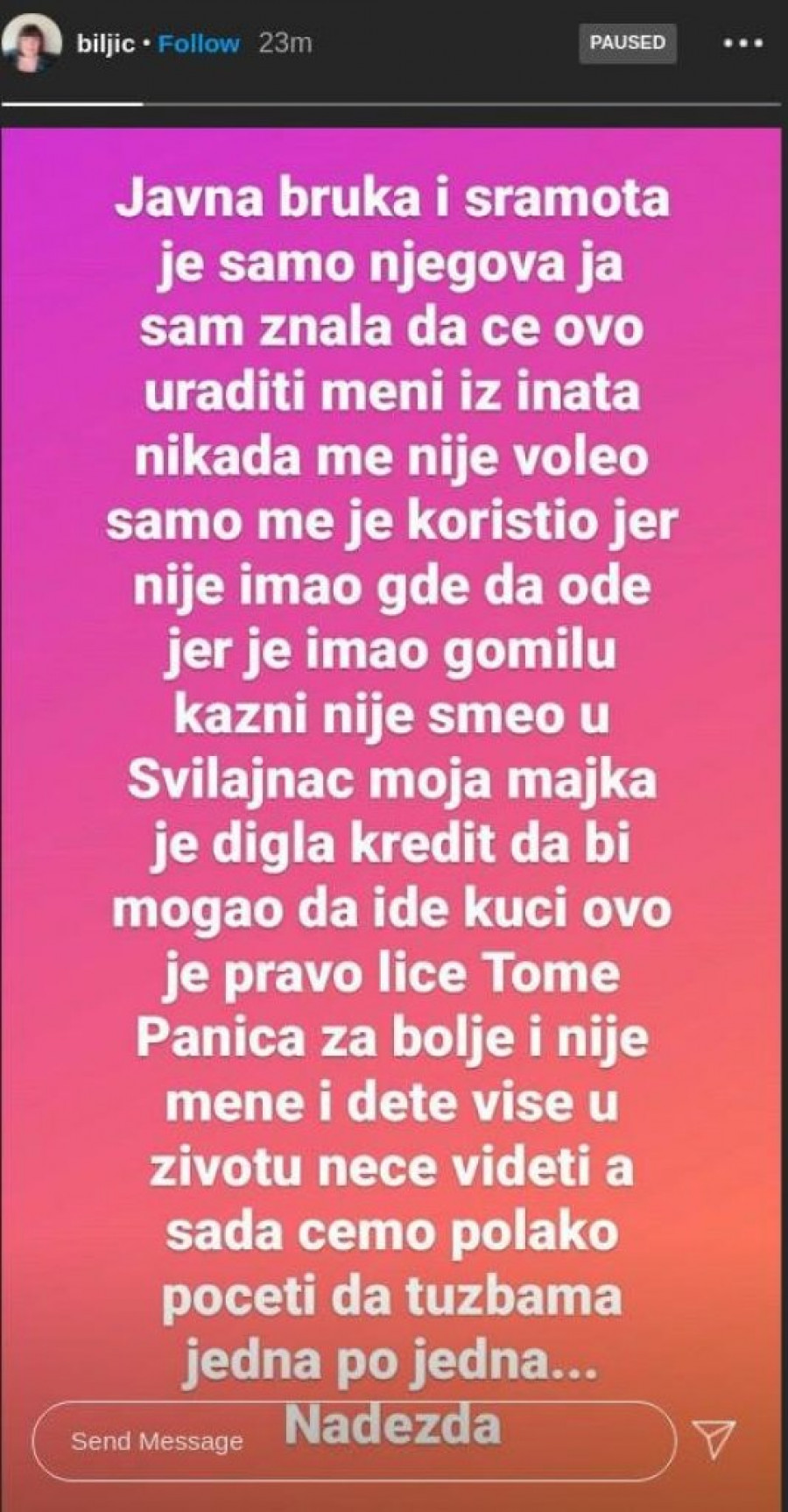 - Javna bruka i sramota je samo njegova. Ja sam znala da će ovo uraditi meni iz inata. Nikada me nije voleo, samo me je koristio jer nije imao gde da ode jer je imao gomilu kazni pa nije smeo u Svilajnac. Moja majka je digla kredit kako bi mogao da ide kući. Ovo je pravo lice Tome Panića za bolje i nije. Mene i dete više u životu neće videti, a sada ćemo polako sa tužbama, jedna po jedna... - napisala je Nadežda vidno izrevoltirana.