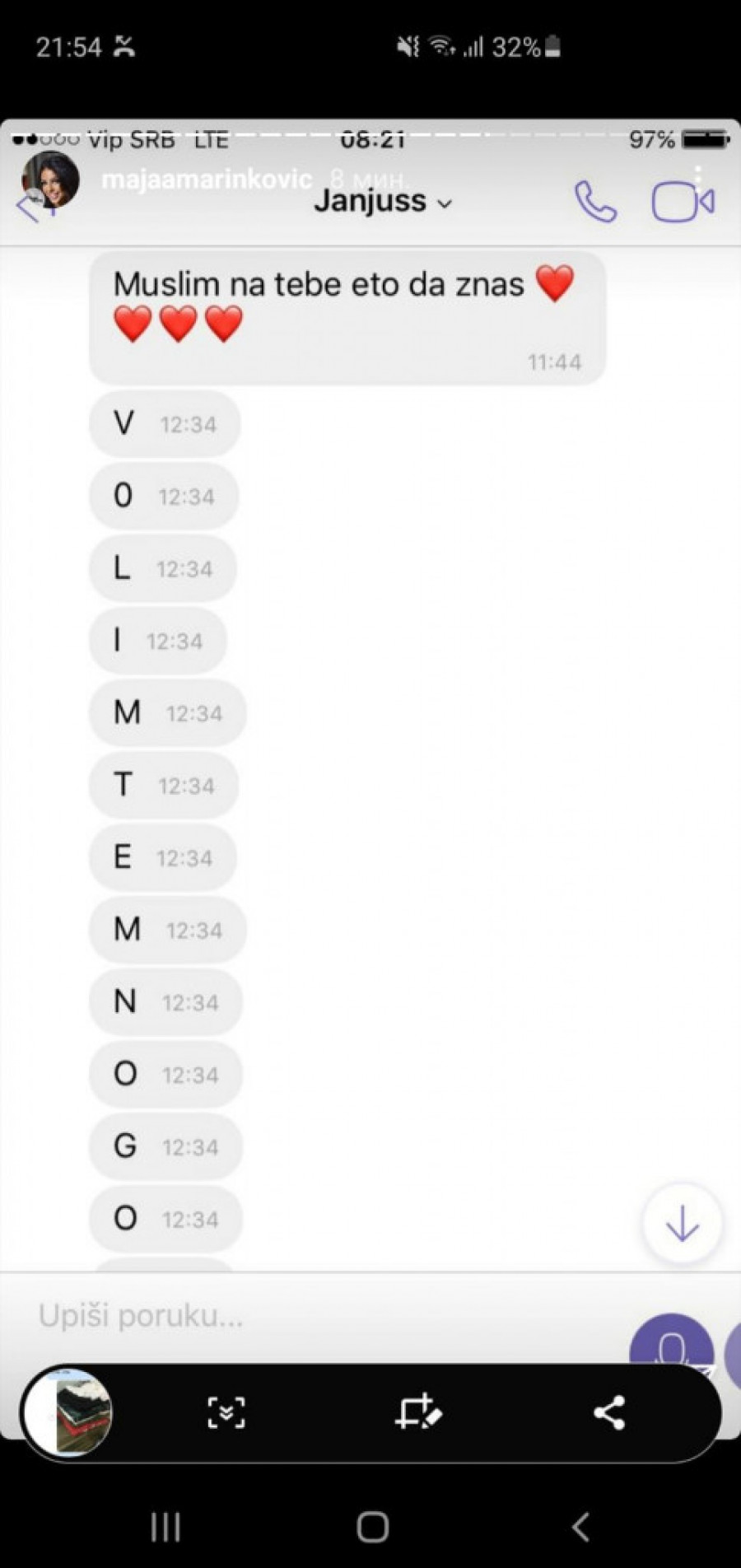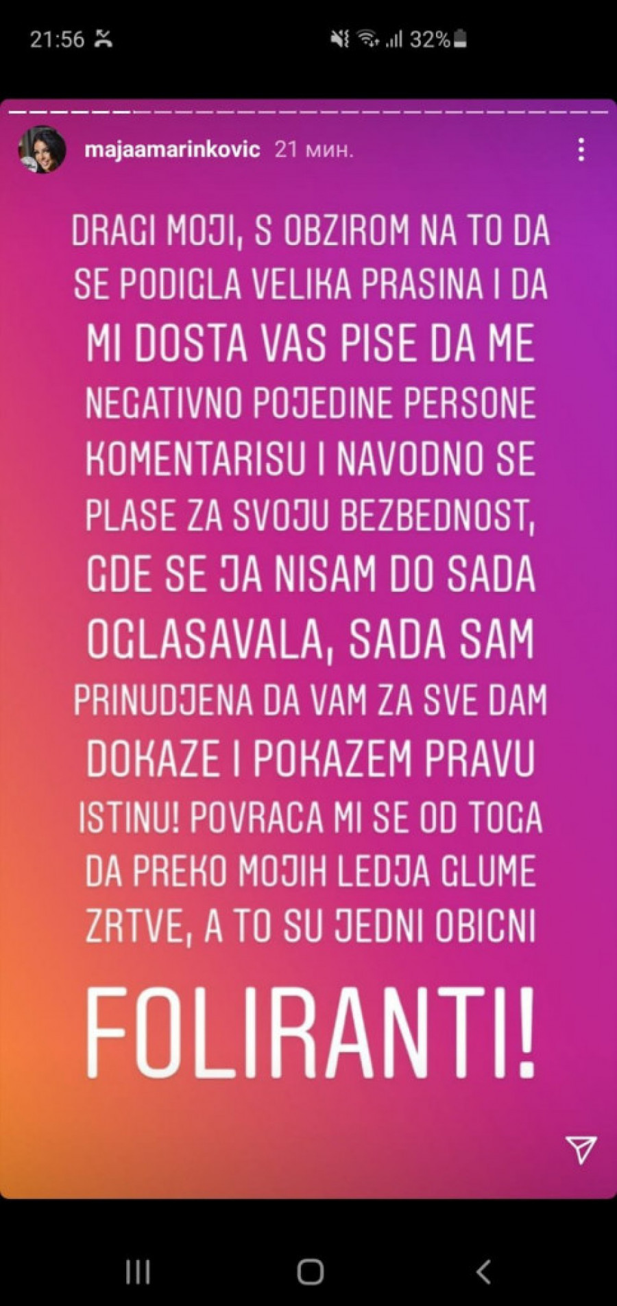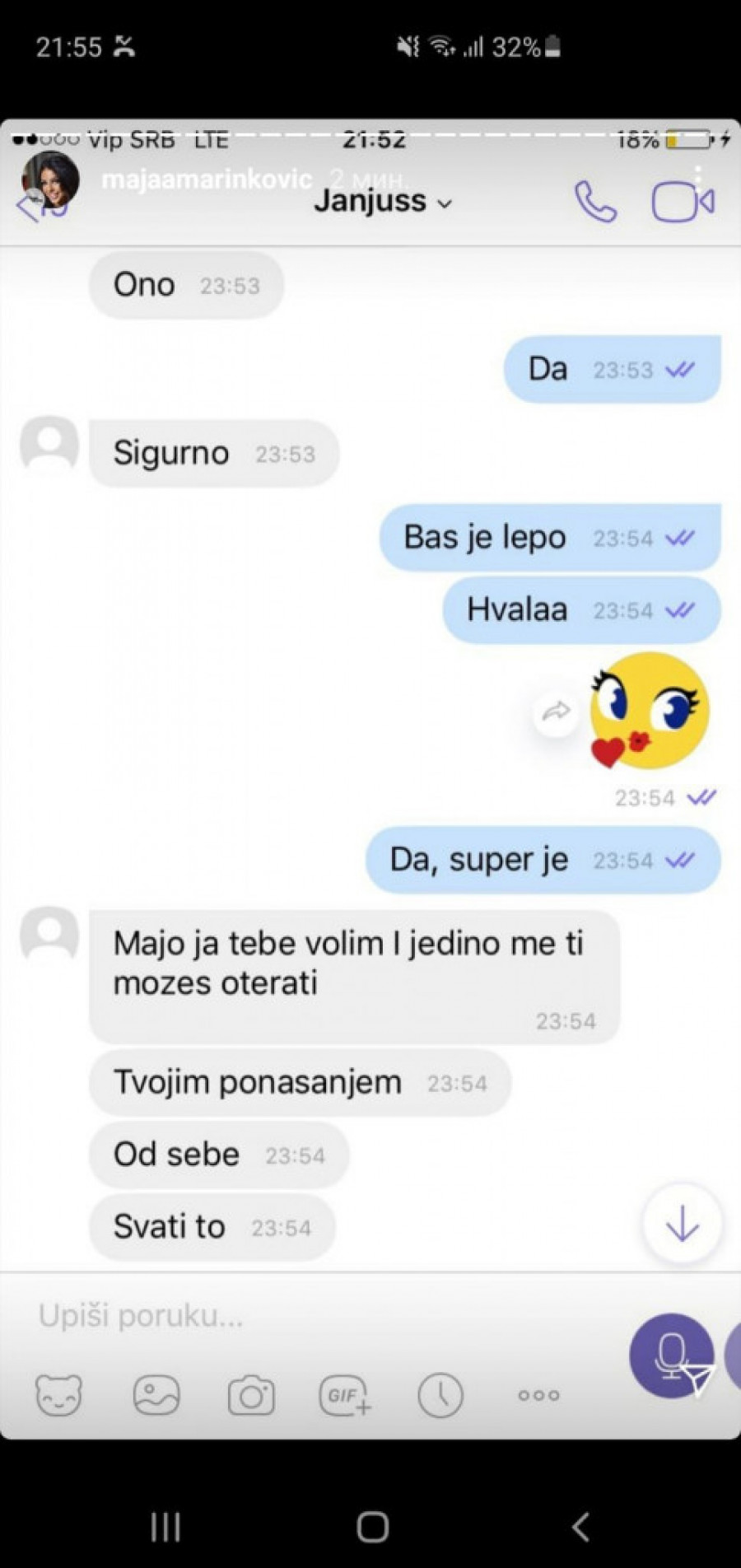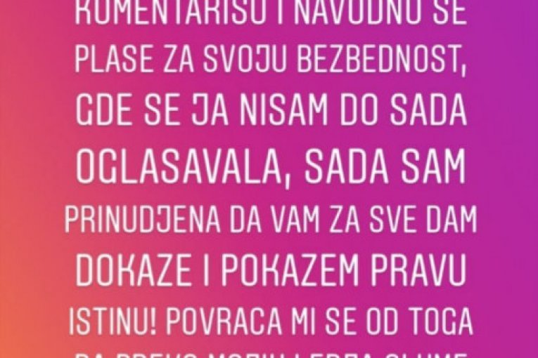 - Dragi moji, s obzirom na to da se podigla velika prašina i da mi dosta vas piše, da me negativno pojedine persone komentarišu i navodno se plaše za svoju bezbednost, gde se ja do sada nisam oglašavala. Sada sam prinuđena da vam za sve dam dokaze i pokažem pravu istinu! Povraća mi se od toga da preko mojih leđa glume žrtve, a to su jedni obični foliranti - napisala je Marinkovićeva a na Instagramu je iznela sav "prljav veš" iz svog odnosa sa Janjušom, uključujući i neke eksplicitne fotografije.