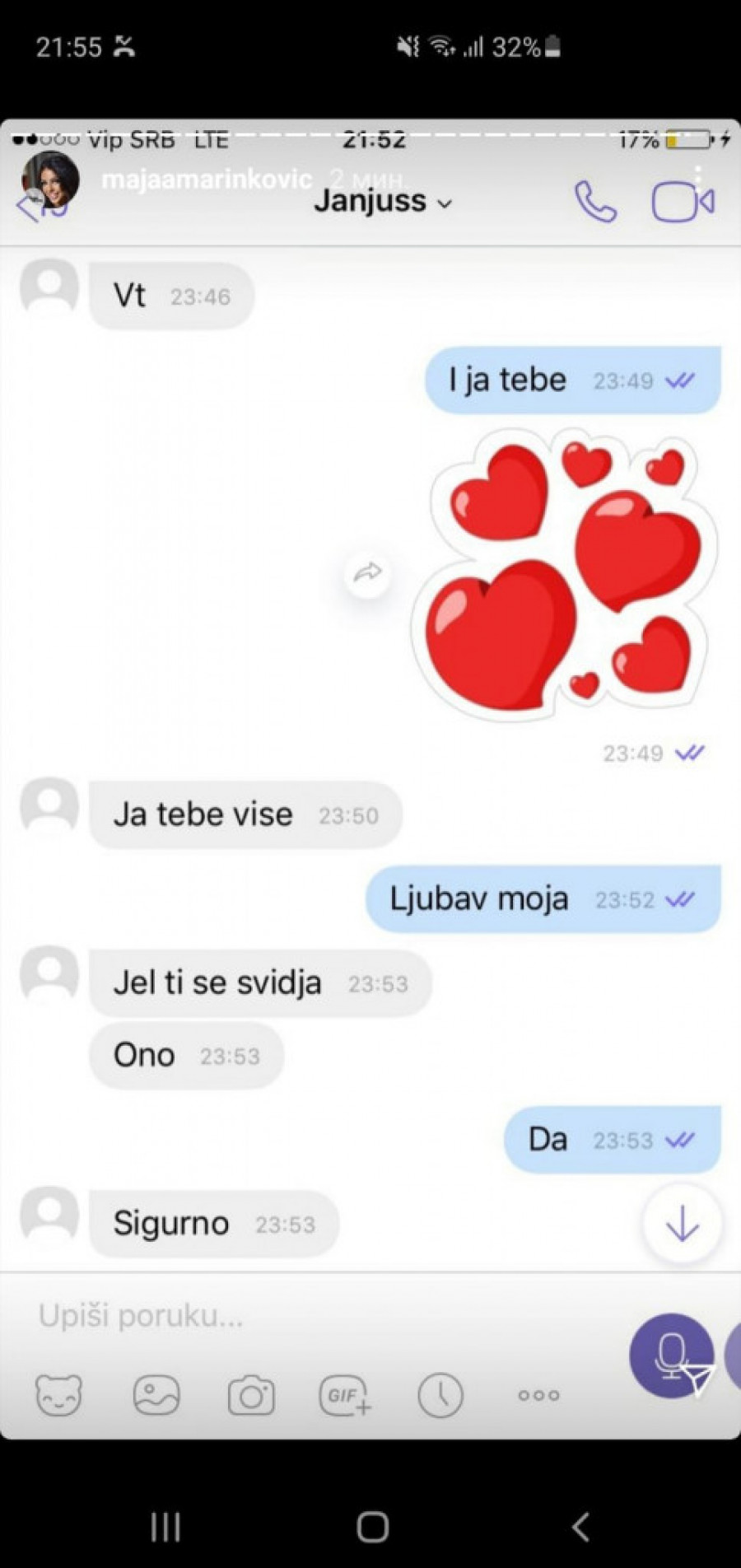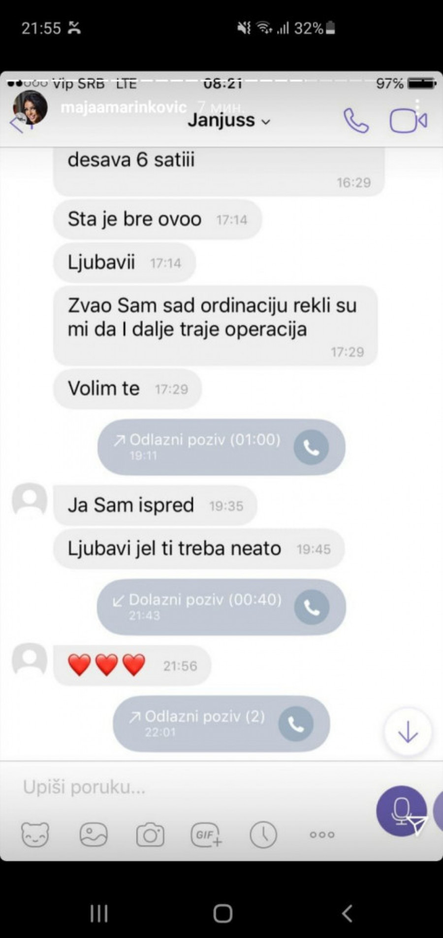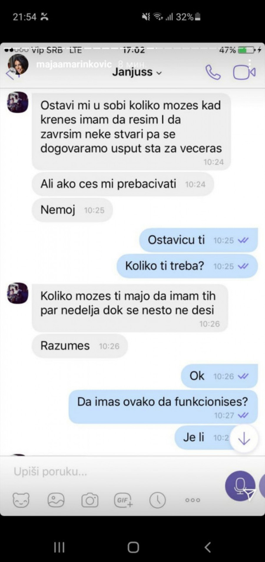 - Dragi moji, s obzirom na to da se podigla velika prašina i da mi dosta vas piše, da me negativno pojedine persone komentarišu i navodno se plaše za svoju bezbednost, gde se ja do sada nisam oglašavala. Sada sam prinuđena da vam za sve dam dokaze i pokažem pravu istinu! Povraća mi se od toga da preko mojih leđa glume žrtve, a to su jedni obični foliranti - napisala je Marinkovićeva a na Instagramu je iznela sav "prljav veš" iz svog odnosa sa Janjušom, uključujući i neke eksplicitne fotografije.