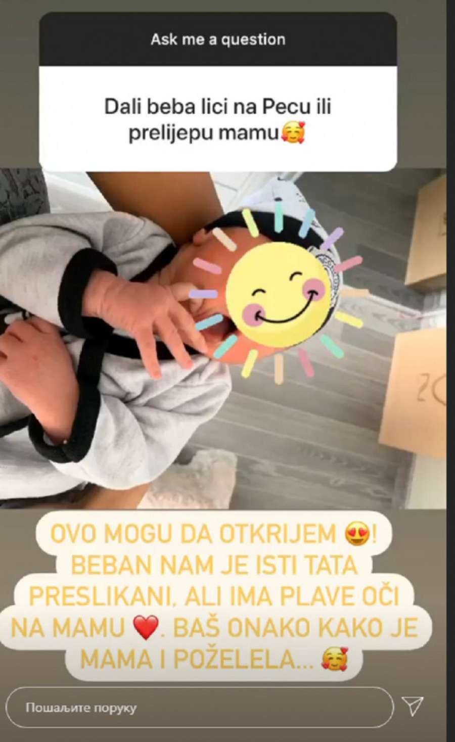 "Beba nam je isti tata, preslikani, ali ima plave oči na mamu. Baš onako kako je mama poželela", otkrila je Aleksandra.