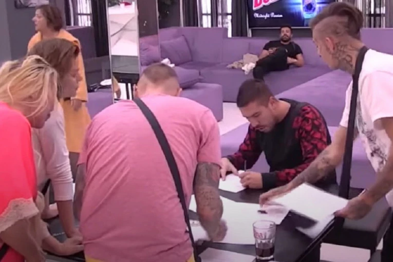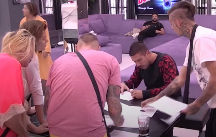 Foto: youtube.com/Zadruga OfficialLepi Mića je okupio zadrugare oko crnog stola da bi potpisali papir na kojem piše koliko je ko dobio budžet od ovonedeljnog vođe Vladmira Tomovića.