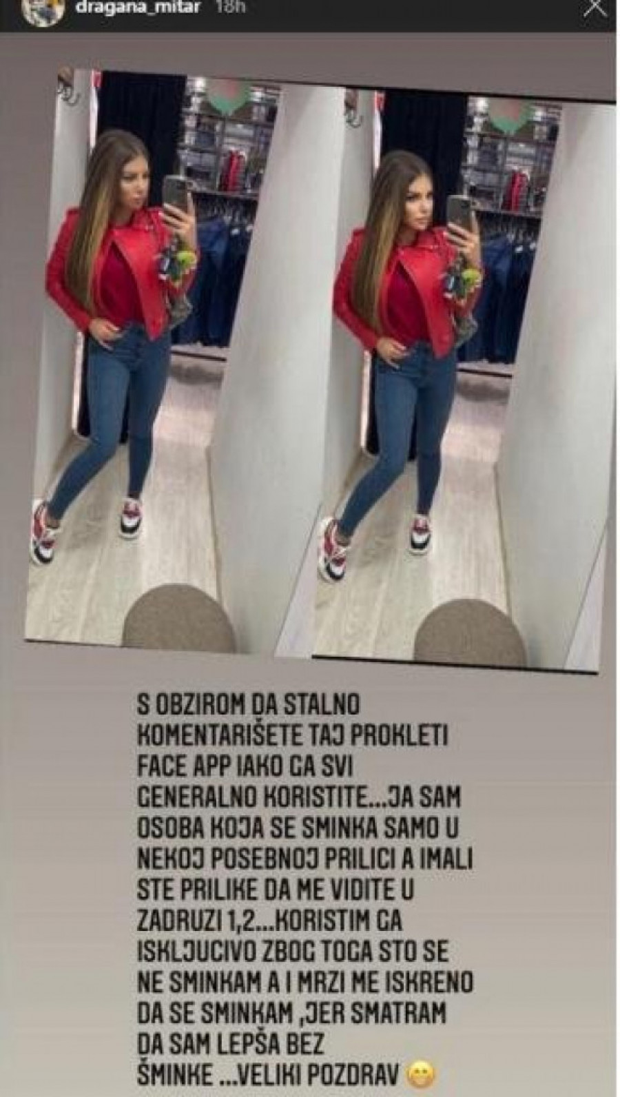 - S obzirom na to da svi komentarišete tu prokletu aplikaciju, iako je svi generalno koristite... Ja sam osoba koja se šminka samo u nekoj posebnoj prilici, a imali ste priliku da me vidite u rijalitiju. Koristim aplikaciju islljučivo zbog toga što se ne šminkam, jer smatram da sam lepša bez šminke. Veliki pozdrav - napisala je ona.