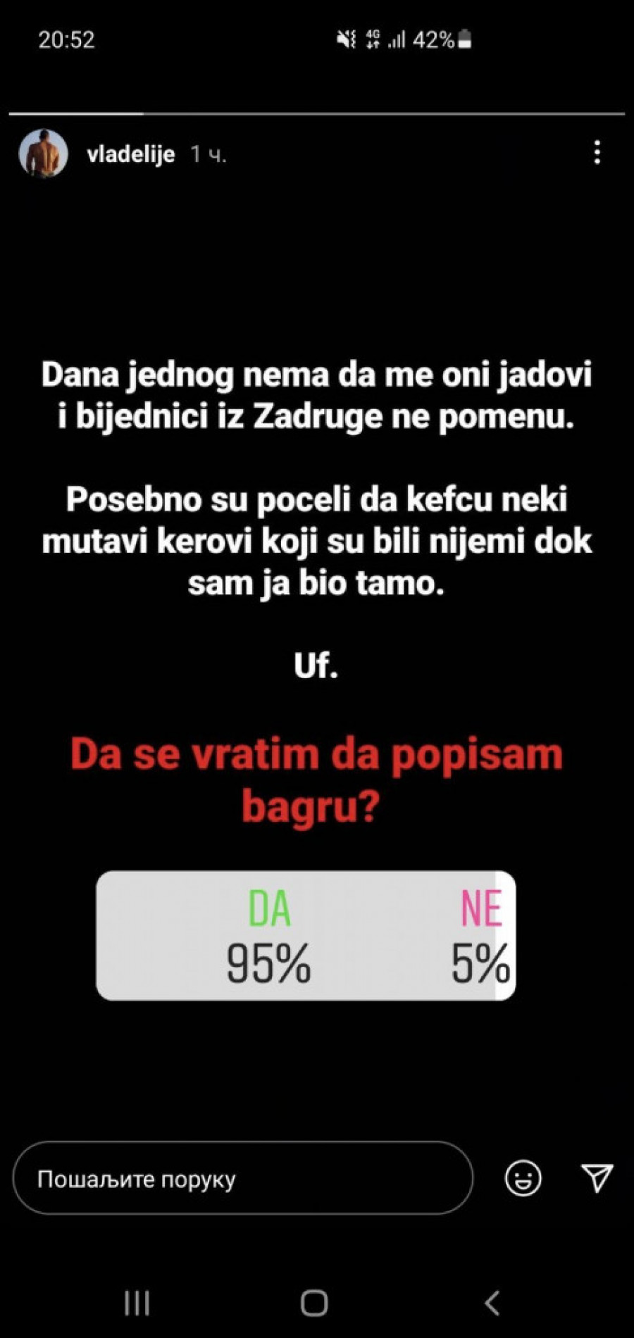 Njegovi pratioci bili su gotovo jednoglasni, te je čak 95% glasalo za da. Ovo naravno ne znači da će se bivši zadrugar vratiti, ali gotovo je izvesno da ako se vrati postojaće velika tenzija između njega i Ša, te je sasvim logično očkivati velike sukobe.