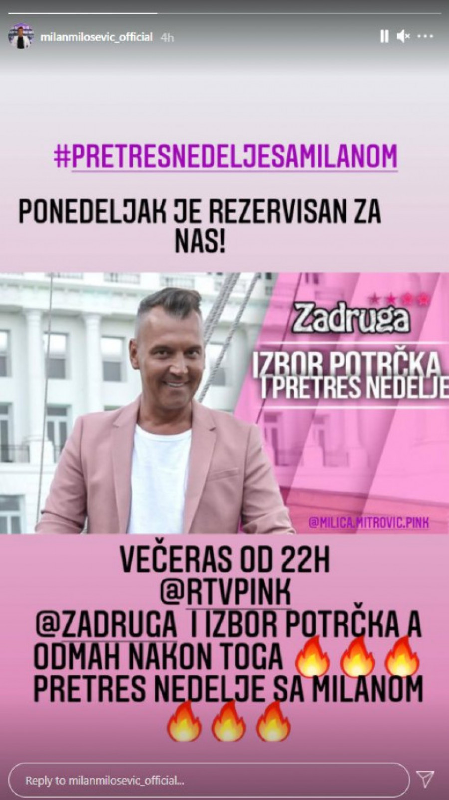 Kao i svakog ponedeljka, večeras će Milan Milošević ući u Zadrugu i prvo će se birati potrčci za ovu nedelju, a onda će uslediti ludilo - Pretres nedelje.