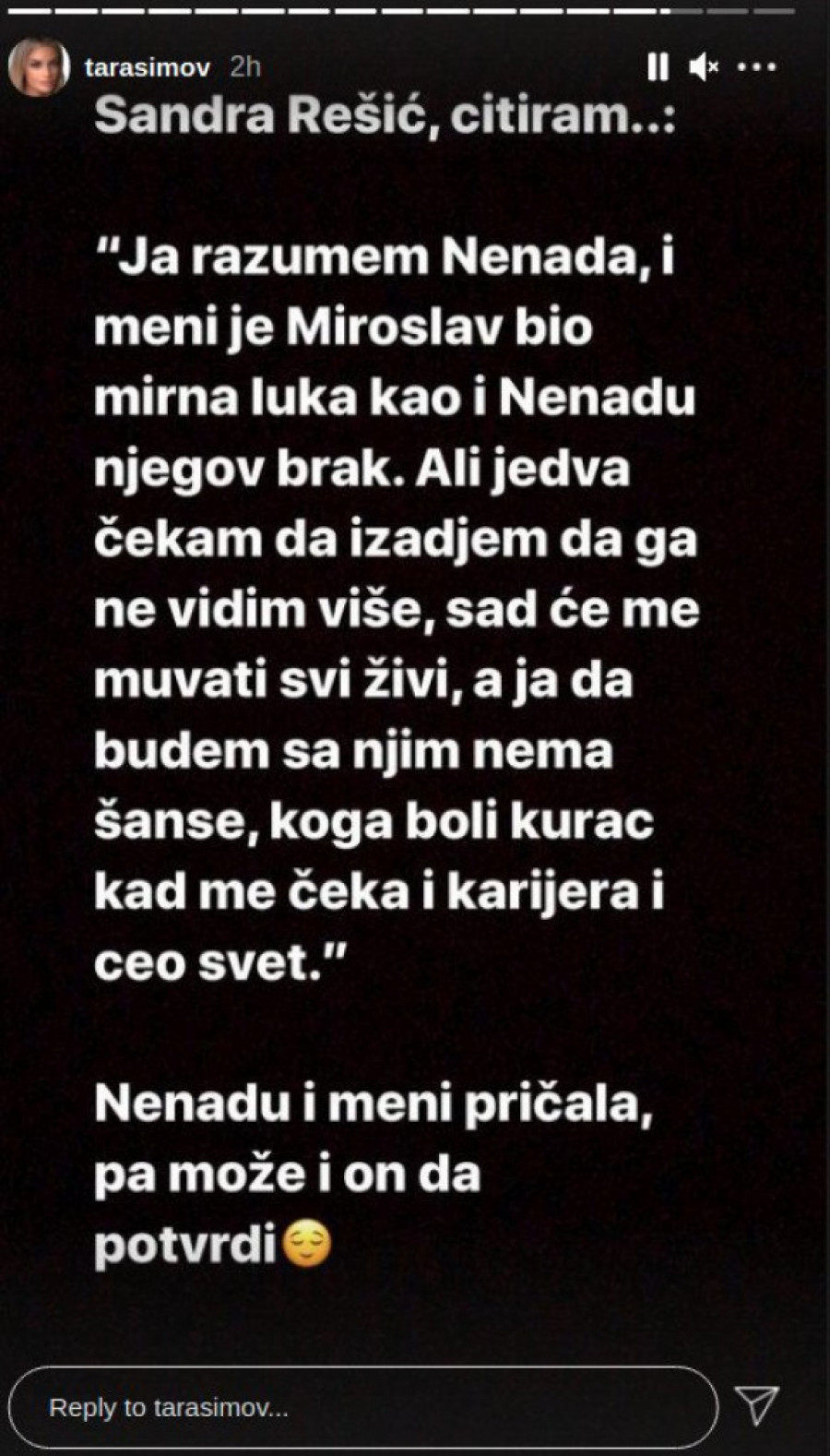 Foto: instagram.com/_tarasimov- Sandra Rešić, citiram: "Ja razumem Nenada i meni je Miroslav bio mirna luka kao i Nenadu njegov brak. Ali jedva čekam da izađem da ga ne vidim više, sad će me muvati svi živi, a ja da budem sa njim nema šanse, koga boli k**ac kad me čeka i karijera i ceo svet". Nenadu i meni pričala, pa može i on da potvrdi - napisala je Tara, pa objavila još jedan stori o raskidu: