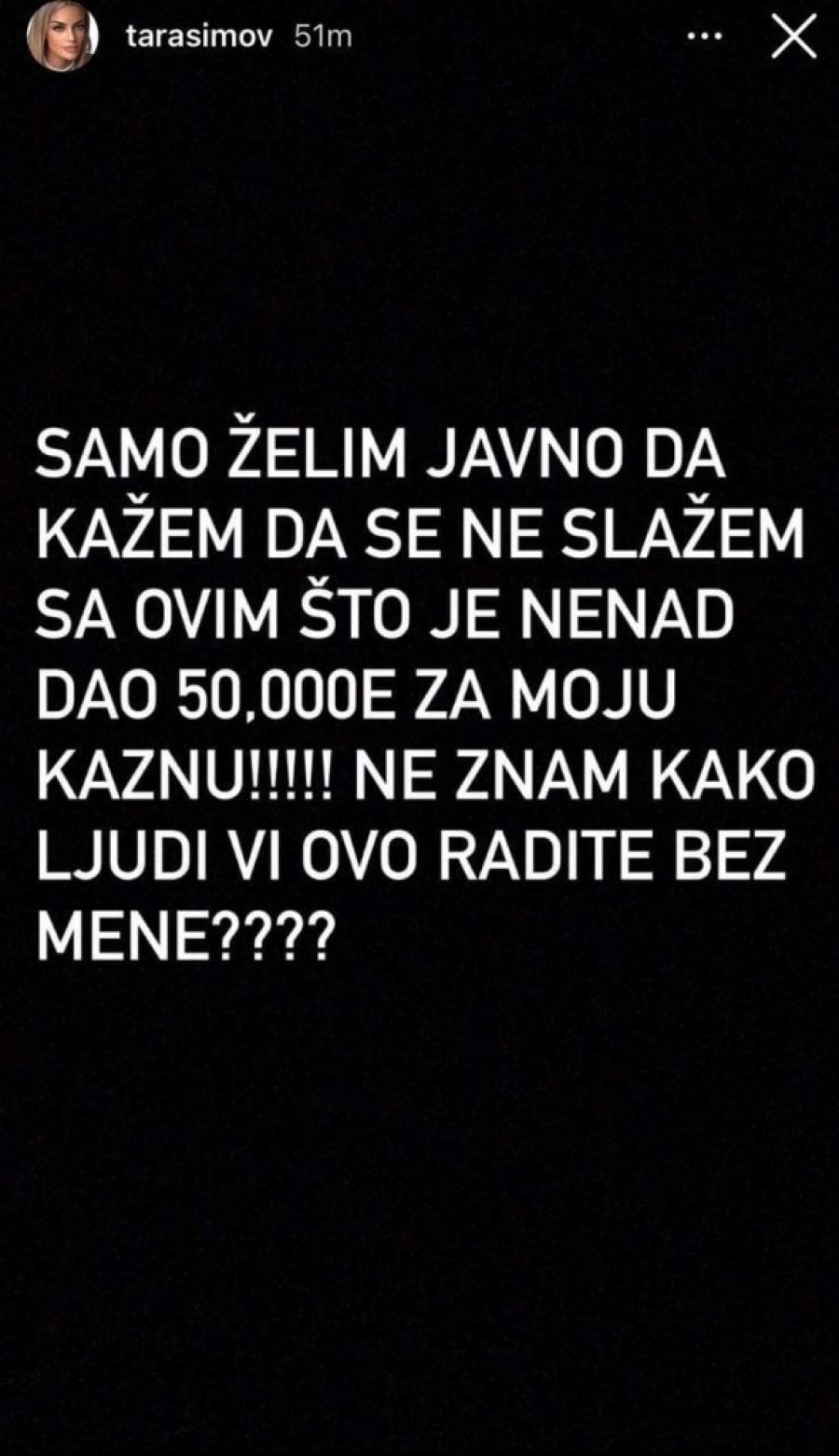 - Samo želim javno da kažem da se ne slažem sa ovim što je Nenad dao 50.000 evra za moju kaznu. Ne znam kako ljudi vi ovo radite bez mene? - napisala je vidno ljuta Tara.