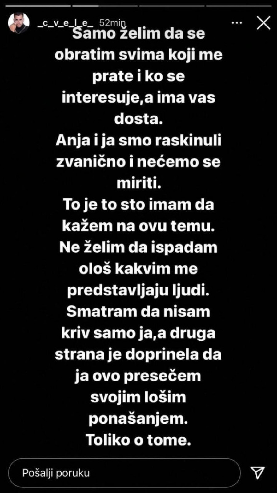 - Samo želim da se obratim svima koji me prate, a ima vas dosta. Anja i ja smo raskinuli zvanično i nećemo se miriti. To je to što imam da kažem na ovu temu. Ne želim da ispadam ološ kakvim me predstavljaju ljudi. Smatram da nisam kriv samo ja, a druga strana je doprinela da ja ovo presečem svojim lošim ponašanjem. Toliko o tome - napisao je Cvele.