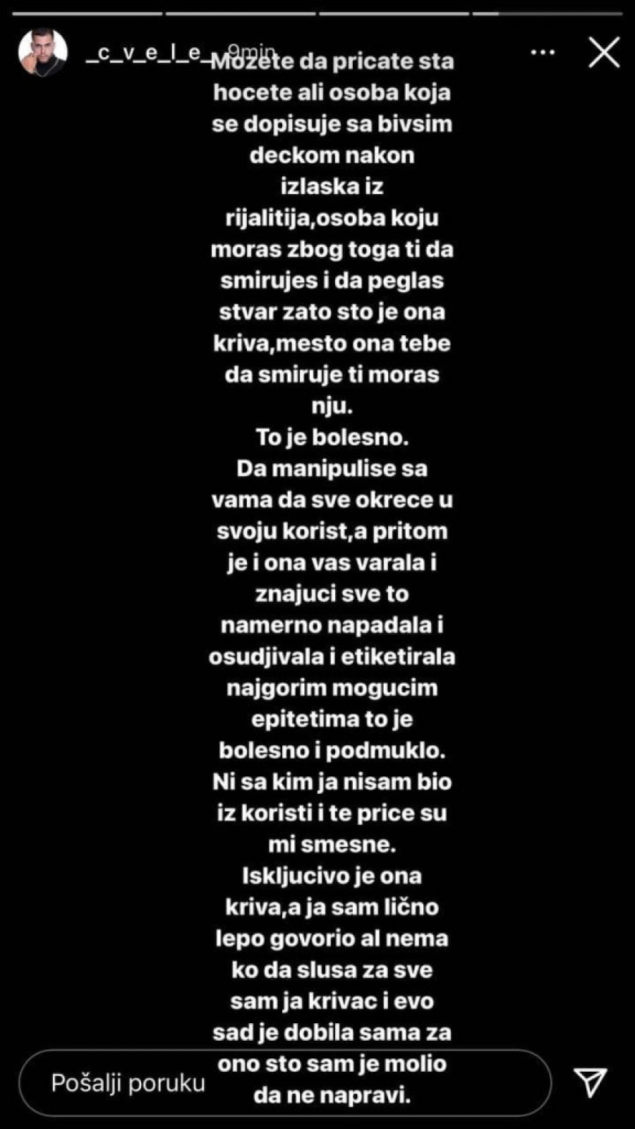 - Možete da pričate šta hoćete, ali osoba koja se dopisuje sa bivšim dečkom nakon izlaska iz rijalitija, osoba koju moraš zbog toga ti da smiruješ i da peglaš stvar zato što je ona kriva, mesto ona tebe da smiruje ti moraš nju. To je bolesno. Da manipuliše vama da sve okreće u svoju korist, a potom je i ona vas varala i znajući sve to namerno napadala i osuđivala i etikirala najgorim mogućim epitetima to je bolesno i podmuklo. Ni sa kim ja nisam bio iz koristi i te priče su mi smešne. Isključivo je ona kriva, a ja sam lično lepo govorio ali nema ko da sluša za sve sam ja krivac i evo sada je dobila sama za ono što sam je molio da ne napravi.