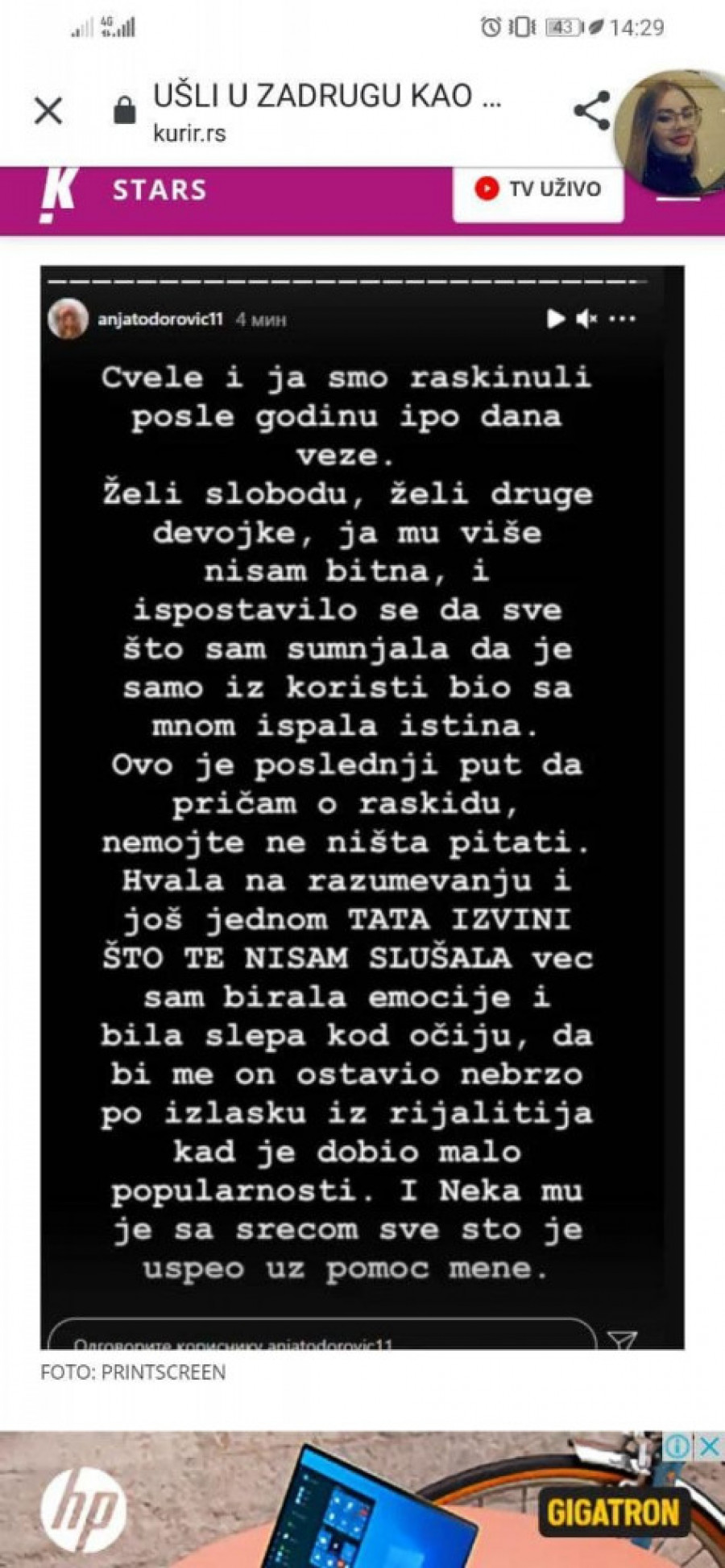 - Cvele i ja smo raskinuli posle godinu i po dana veze. Želi slobodu, želi druge devojke, ja mu više nisam bitna, i ispostavilo se da sve što sam sumnjala da je samo iz koristi sa mnom bila istina. Ovo je poslednji put da pričam o raskidu, nemojte me ništa pitati. Hvala na razumevanju i još jednom, tata, izvini što te nisam slušala, već sam birala emocije i bila slepa kod očiju, da bi me on ostavio nebrzo po izlasku iz rijalitija kad je dobio malo popularnosti. I neka mu je sa srećom sve što je uspeo uz pomoć mene – napisala je Anja.