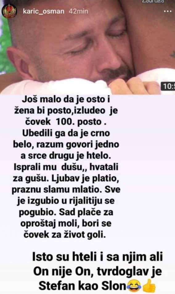 - Još malo da je ostao i žena bi postao, izludeo je čovek 100 odsto. Ubedili ga da je crno belo, razum govori jedno, a srce je drugu htelo. Isprali mu dušu, hvatali za gušu. Ljubav je platio, praznu slamu mlatio. Sve je izgubio, u rijalitiju se pogubio. Sad plače, za oproštaj moli, bori se čovek za život goli - napisao je Osman u svojoj objavi.