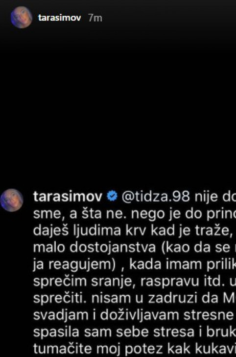 Tara Simov je napustila studijom ne želevši da se susretne sa Đedovićem, nakon čega je javnost osudila i okarakterisala njen potez kao kukavički. Simova je odgovorila na jedan od komentara jasno iskazavši svoj stav povodom sinoćne situacije, a onda to objavila i na svom Instagram profilu, rešivši da stavi tačku na celu tu priču.