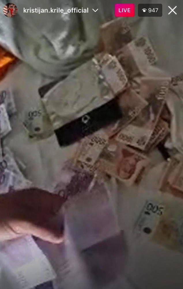 Ono što je sve šokiralo jeste Kristijanov potez kada je uključio uživo prenos na njegovom zvaničnom Instagram profilu i počeo da maše novčanicama. Kristijan je sve vreme snimao Kristinu i sebe kako se igraju sa evrima, pa su se valjali i mazili sa njima.