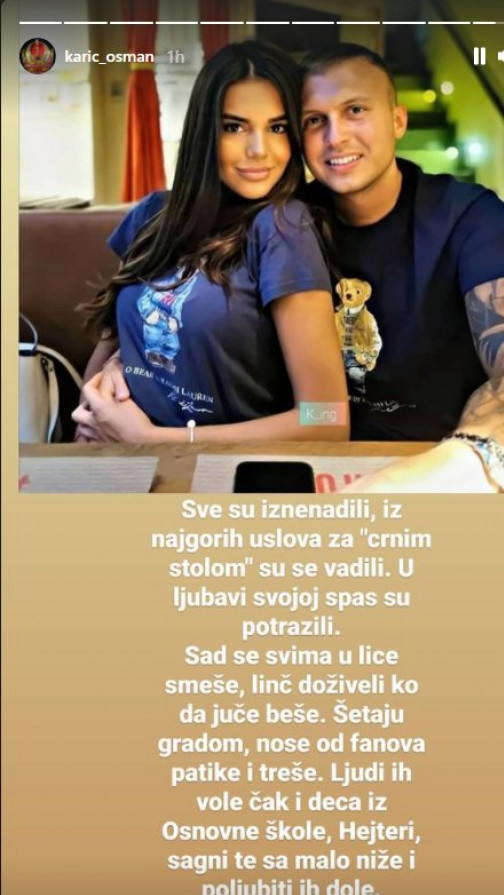 Foto: printscreen/pinktv- Sve su iznenadili, iz najgorih uslova za ,,crnim stolom" su se badili. U ljubavi svojoj spas su potražili. Sad se svima ulice smeše, linč doživeli ko da juče beše. Šetaju gradom, nose od fanova patike i treše. Ljudi ih vole, čak i deca iz Osnovne škole. Hejteri, sagni te se malo niže i poljubiti ih dole. PS. Poljupce dozvoljvaju sad u sredu, poljubac može samo u p*du (d*pe) - napisao je Osman.