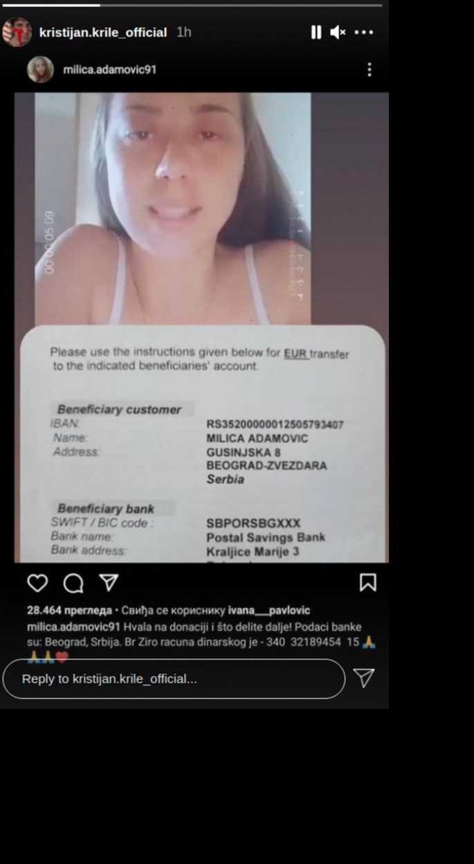 Foto: Instagram/printscreenSada je imao novu objavu što se tiče nje, objavio je njen snimak i pozvao ljude da pomognu u vidu novčanih sredstava.