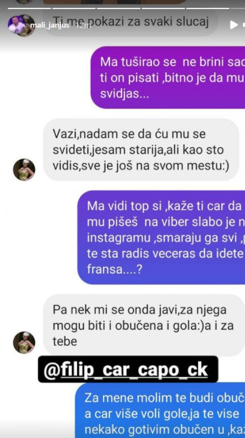 Foto: youtube.com/Zadruga OfficialBivši zadrugar Marko Janjušević Janjuš na Instagram storiju objavio je šokantnu prepisku sa misterioznom damom, koja je želela da ga ima samo za sebe. Naime, izvesna gospođa je htela da se dopisuej sa Filipom Carem, ali je preko Janjuša htela da dobije njegovu pažnju, što joj je definitivno pošlo za sukom.