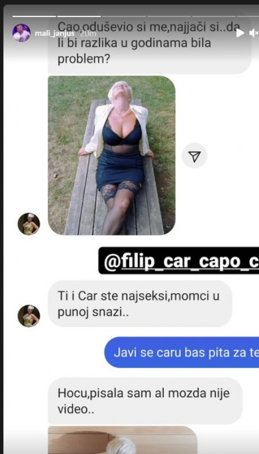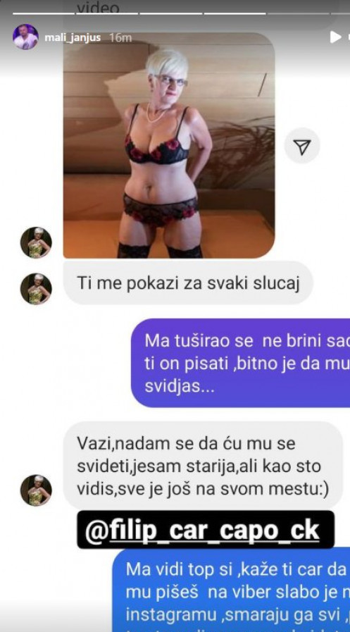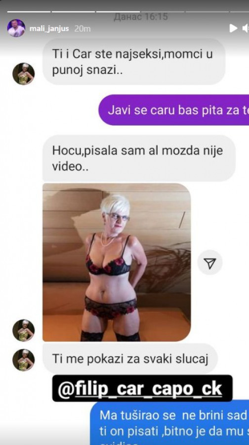 Ono što je dodatno šokiralo Janjuševe pratioce jeste fotografije koje je dobio od dame u godinama koja mu se javila. U pitanju su bile provokativne, vrele fotke, na koje je Janjuš odgreaovao u njegovom stilu. On je najpre pokušao da napravi njegovu ,,sprdnju", a potom je loptu prebacio na Cara.
