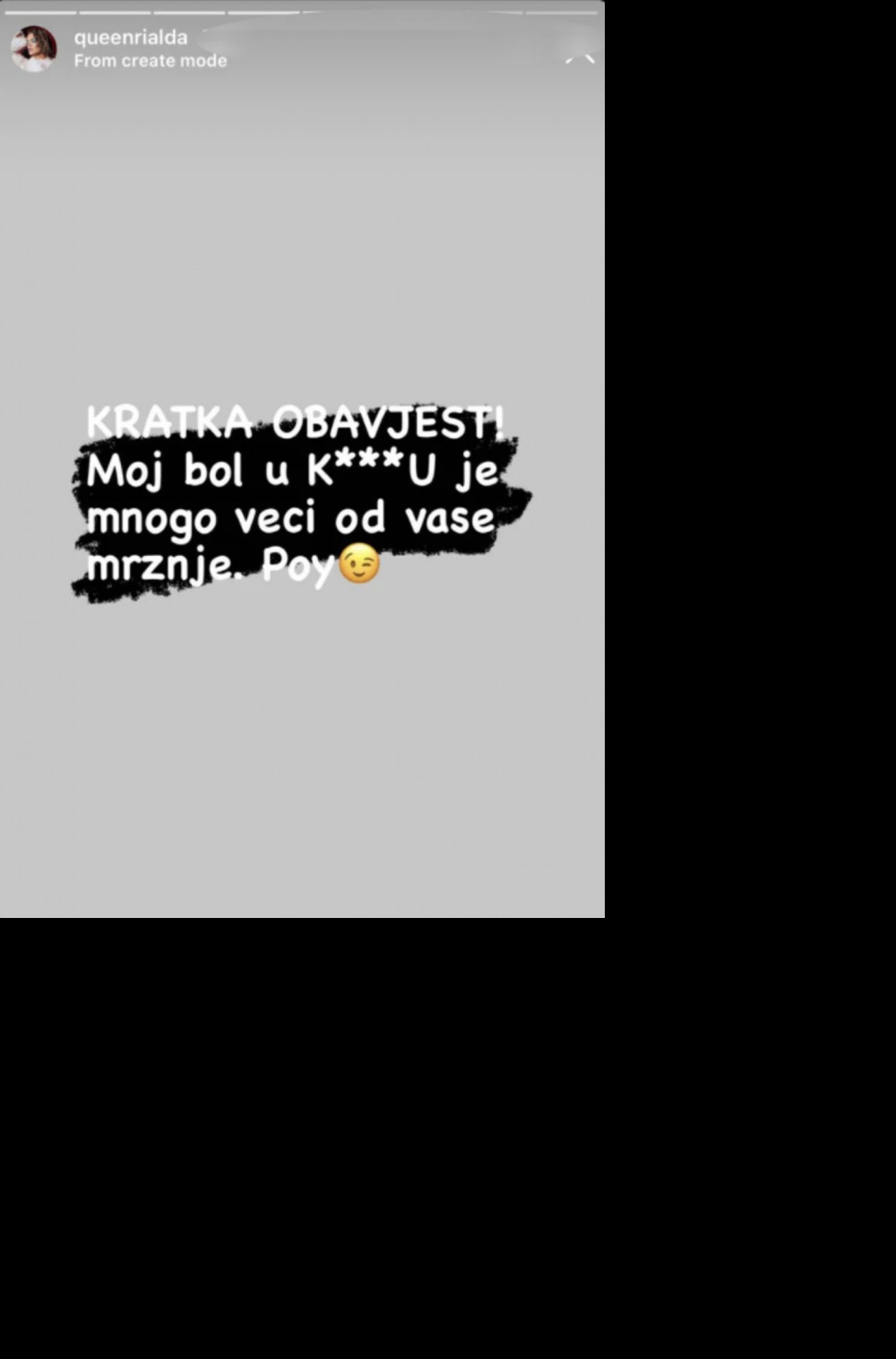 "Kratko obaveštenje. Moj bol u k**cu je mnogo veći ood vaše mržnje", napsala je Rialda.