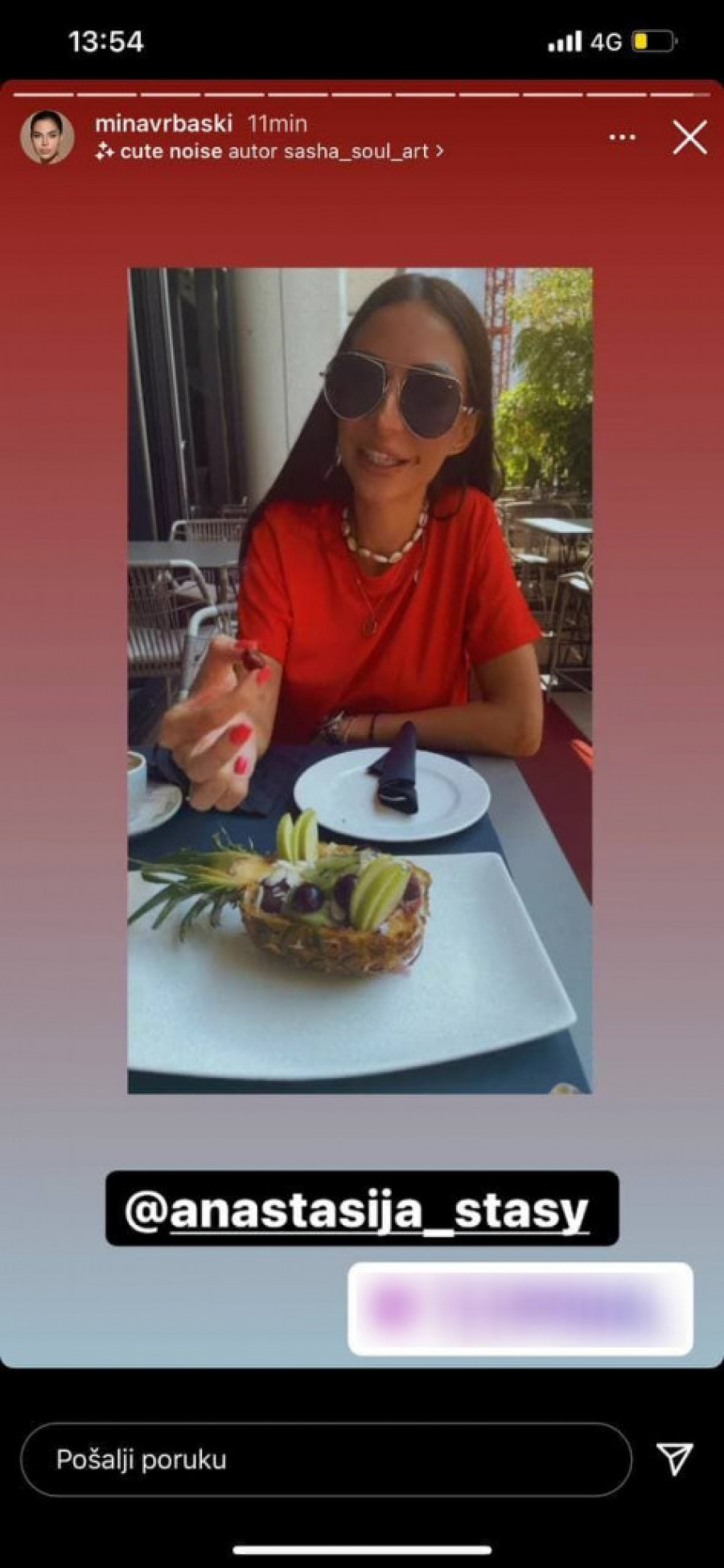 Ipak, danas je Mina vrlo aktivna na društvenoj mreži instagram, te se na njenim storijima može videti da trenutno sedi sa Anastasijom Buđić na skupocenom i luksuznom mestu dok uživaju u ručku, voću i kafi.