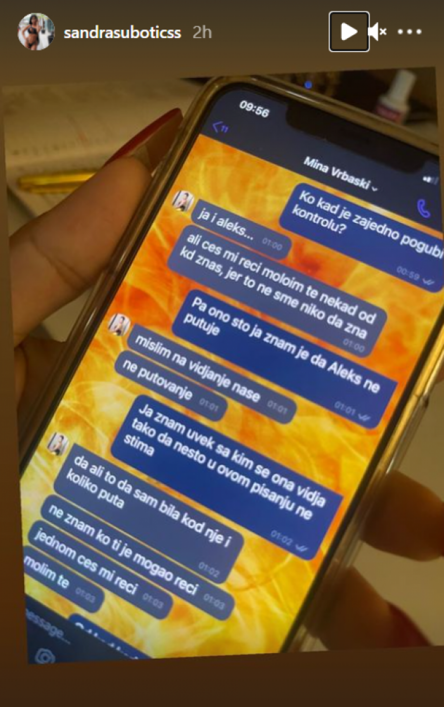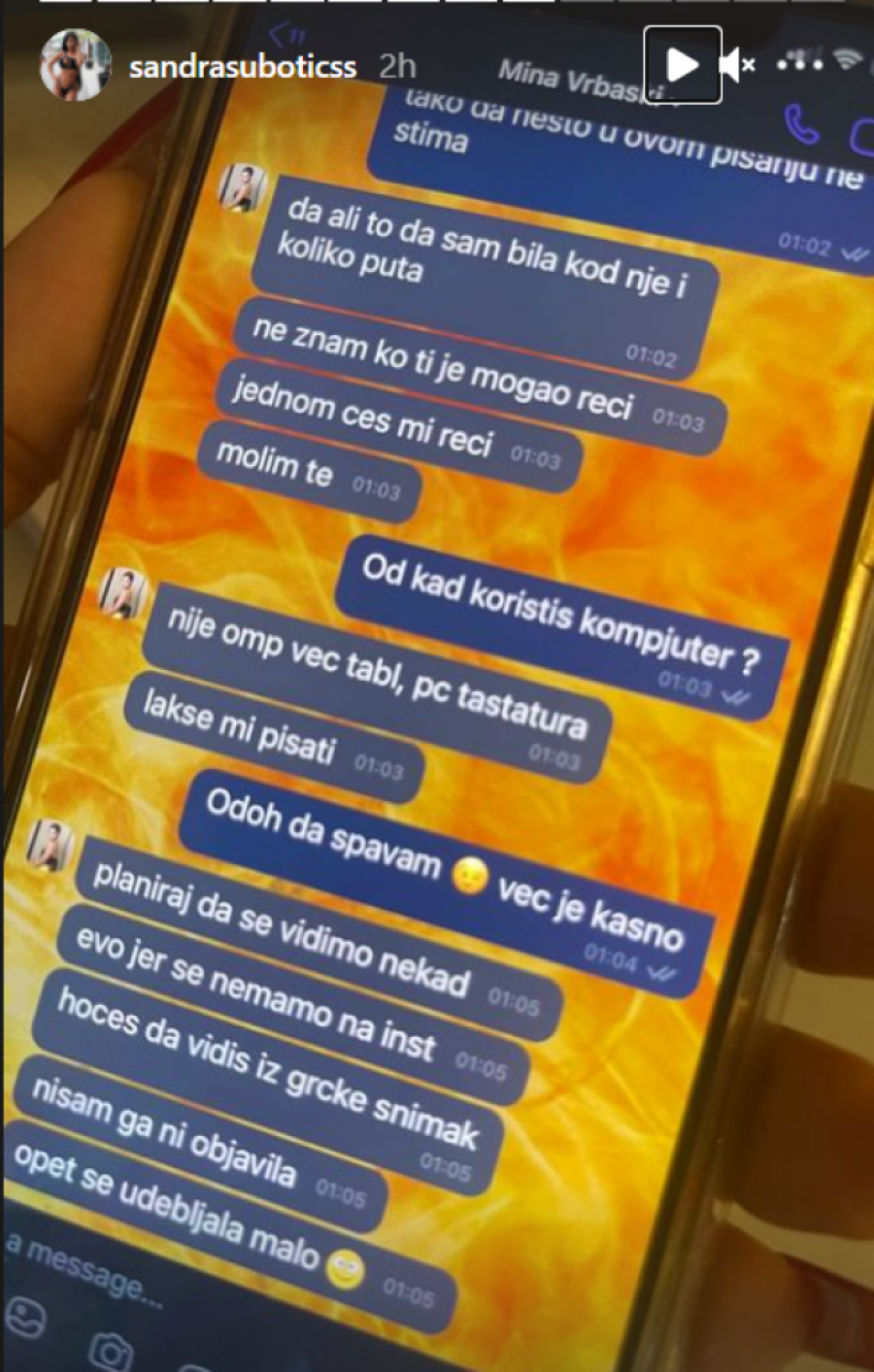 Bivša zadrugarka Aleksandra Subotić na svom Instagram profilu objavila je prepisku njene majke Ljube Pantović sa navodnim brojem Mine Vrbaški, a onda otkrila da je sve to jedna prevara jer se njena majka i Mina nisu čule godinu dana, a da su navodi napisani Ljubi da se njih dve provode njoj iza leđa, lažni.