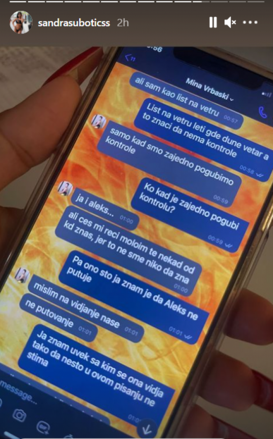 - Da li je moguće da postoje toliko bolesni mozgovi i toliko ZLOBNI "ljudi" koji ne žive svoje živote i koji pokušavaju iz samo sebi znanih razloga da se mešaju u tuđe živote?! Pre svega previše ste glupi da pravite priče na moj račun! Osoba koja se predstavila kao Mina Vrbaški - a ja iskreno ne verujem da je to ona, je noćas pisala mojoj mami (sa kojom se ne čuje od prošle godine) poruke u jedan ujutru pokušavajući da dobije dokaz da se mi tajno viđamo i aludirajući na to da ja negde s njom ludujem, provodim vreme i putujem. Moja mama u svakoj sekundi zna gde se ja nalazim, a ja svoje vreme provodim isključivo sa svojom decom i porodicom. P.S. Jadni ste i bedni – napisala je Aleksandra, a onda u nastavku objavila i celokupnu prepisku.