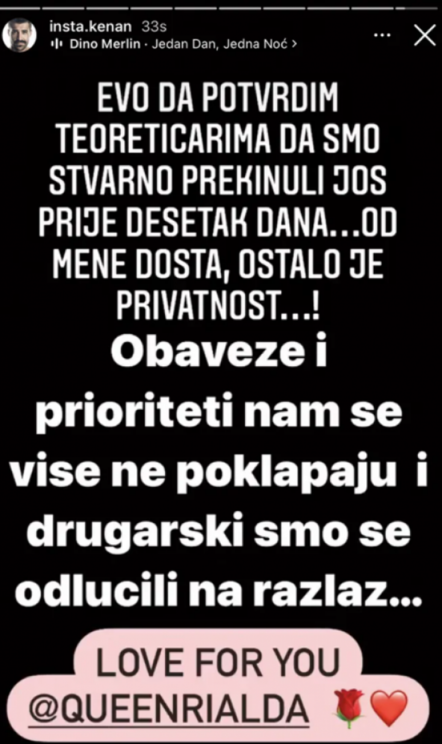 - Evo da potvrdim teoretičarima da smo stvarno prekinuli još pre 10 dana. Od mene dosta. Ostalo je privatnost! Obaveze i prioriteti nam se više ne poklapaju i drugarski smo se odlučili na razlaz. Ljubav za Rialdu - napisao je Tahirović i tagovao Rialdu uz emotikon crvene ruže i srca.