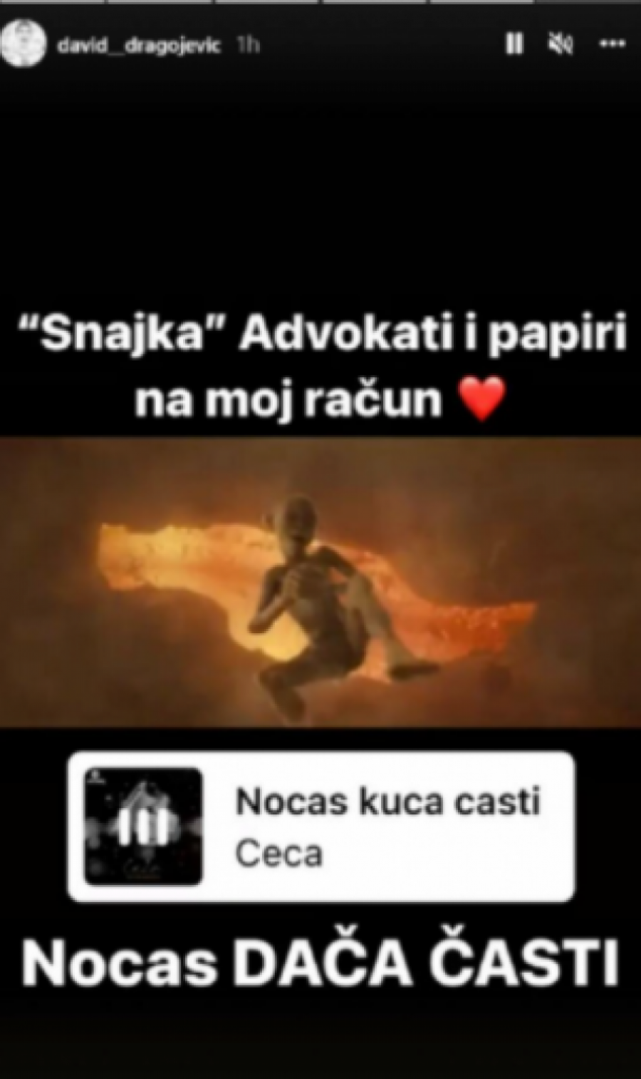 - ''Snajka'' advokati i papiri na moj račun! Noćas Dača časti - napisao je David, dok je u pozadini išla pesma ''Noćas kuća časti''.