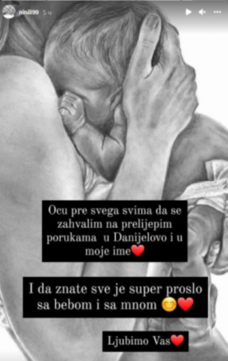 - Hoću pre svega svima da se zahvalim na prelepim porukama u Danijelovo i u moje ime. I da znate da je sve super prošlo i sa bebom i sa mnom. Ljubimo vas - poručila je novopečena mama.