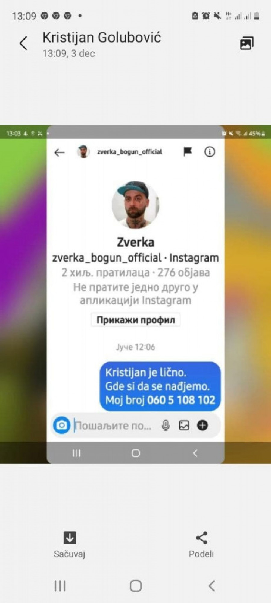 - Kristijan je lično. Gde si da se nađemo? - napisao je Kristijan prvi poruku svom ljutitom rivalu Zverki, a ubrzo je usledio i Aleksandrov odgovor: