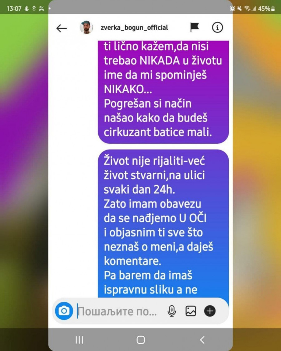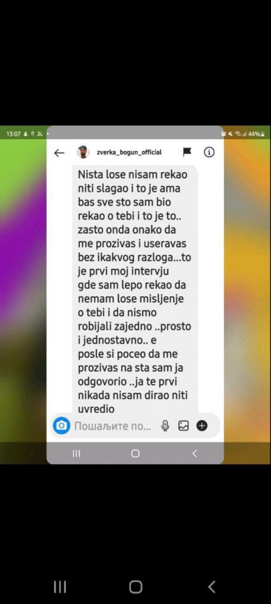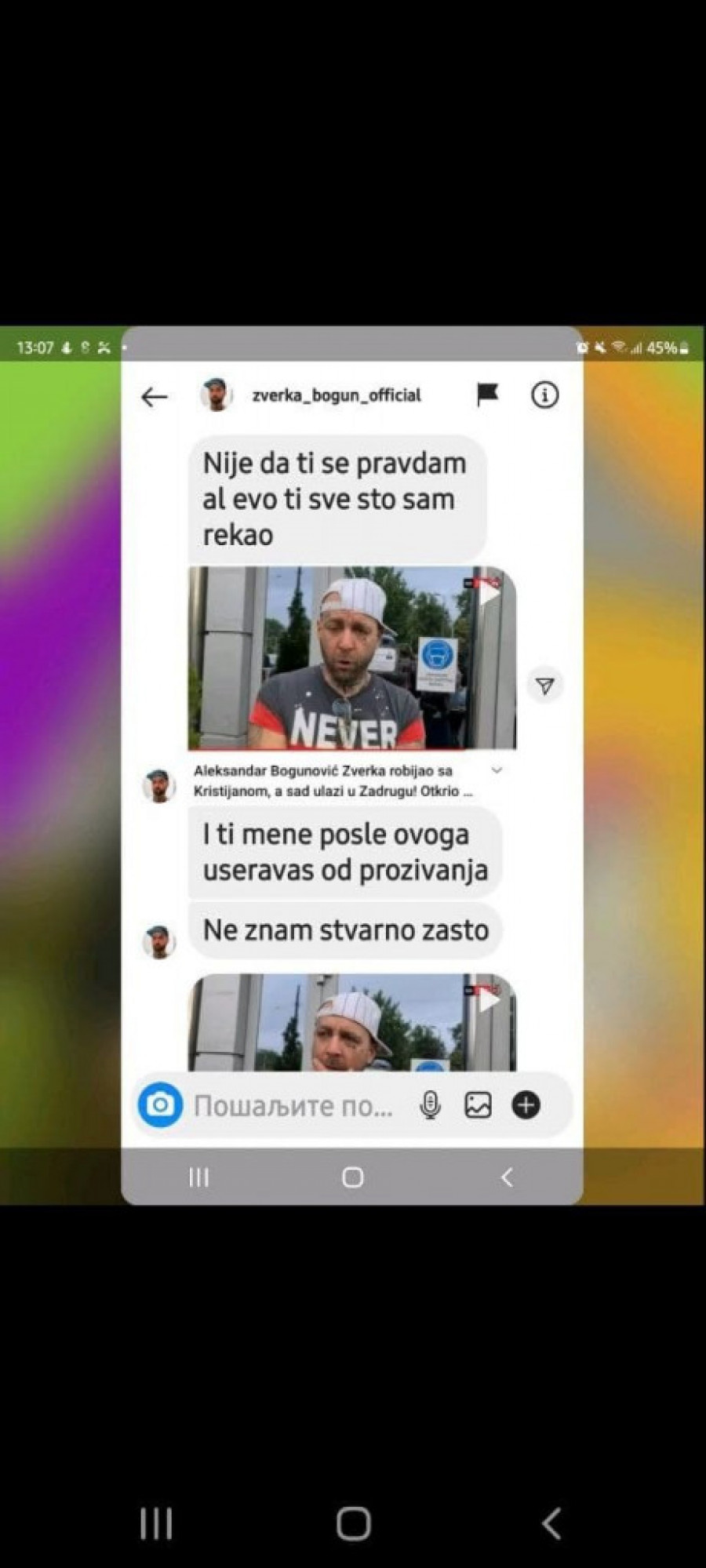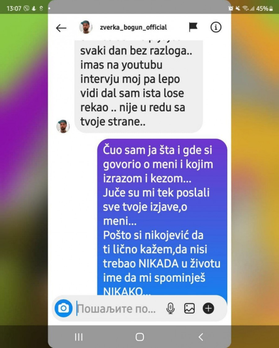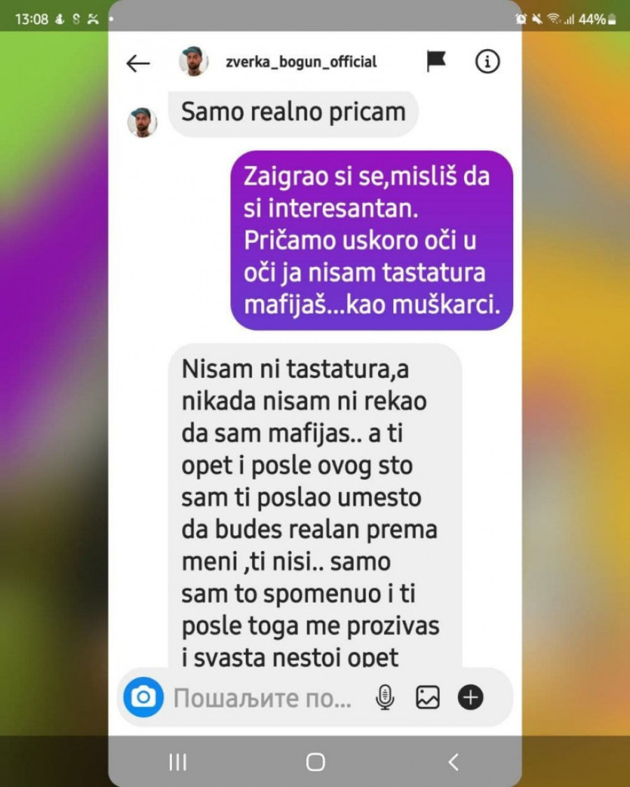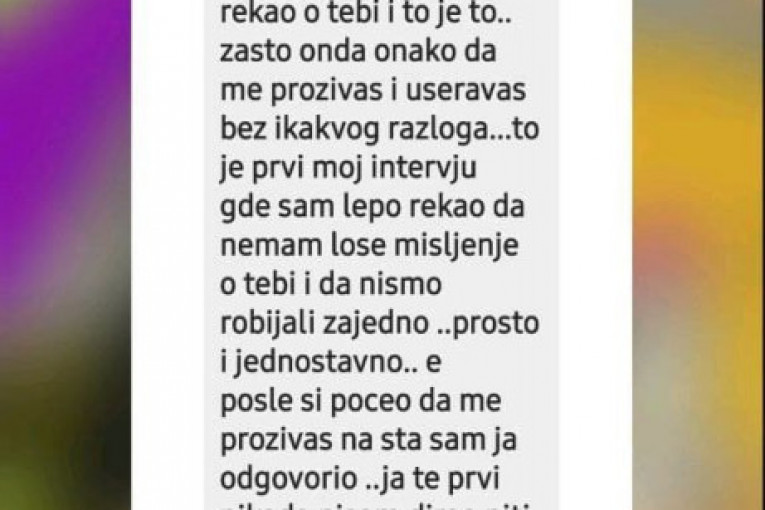 - Ništa loše nisam rekao, niti slagao, i to je ama baš sve što sam pričao o tebi. Zašto me prozivaš onda i u*eravaš bez ikakvog razloga? U prvom intervju- u sam naveo da nemam loše misljenje o tebi i da nismo robijali zajedno. Prosto i jednostavno, e posle si počeo da me prozivaš, na šta sam ja odgovorio. Prvi te nikada nisam napao, niti dirao - smatra Zverka, međutim to nije uverilo Kristijana, te je on idalje nastavio da instistira na razrešenju konflikta u četiri oka: