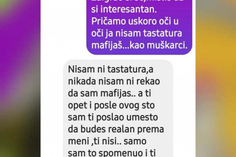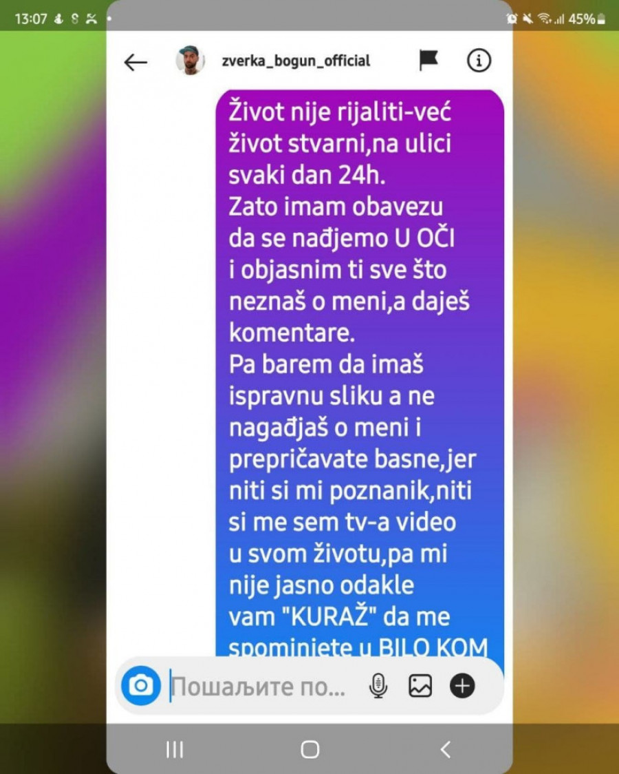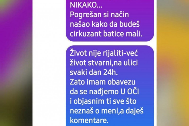 - Čuo sam ja šta si i gde si pričao o meni i kojim izrazom i kezom. Juče su mi tek poslali sve tvoje izjave o meni. Pošto si Nikojević da ti lično kažem, da nisi trebao nikada u životu da me spominješ. Nikako. Život nije rijaliti, već stvarni život. Zato imam obavezu da se nađemo u oči i da ti objasnim sve što ne znaš o meni, a daješ komentare. Pa barem da imaš ispravnu sliku o meni - napisao je Kristijan.
