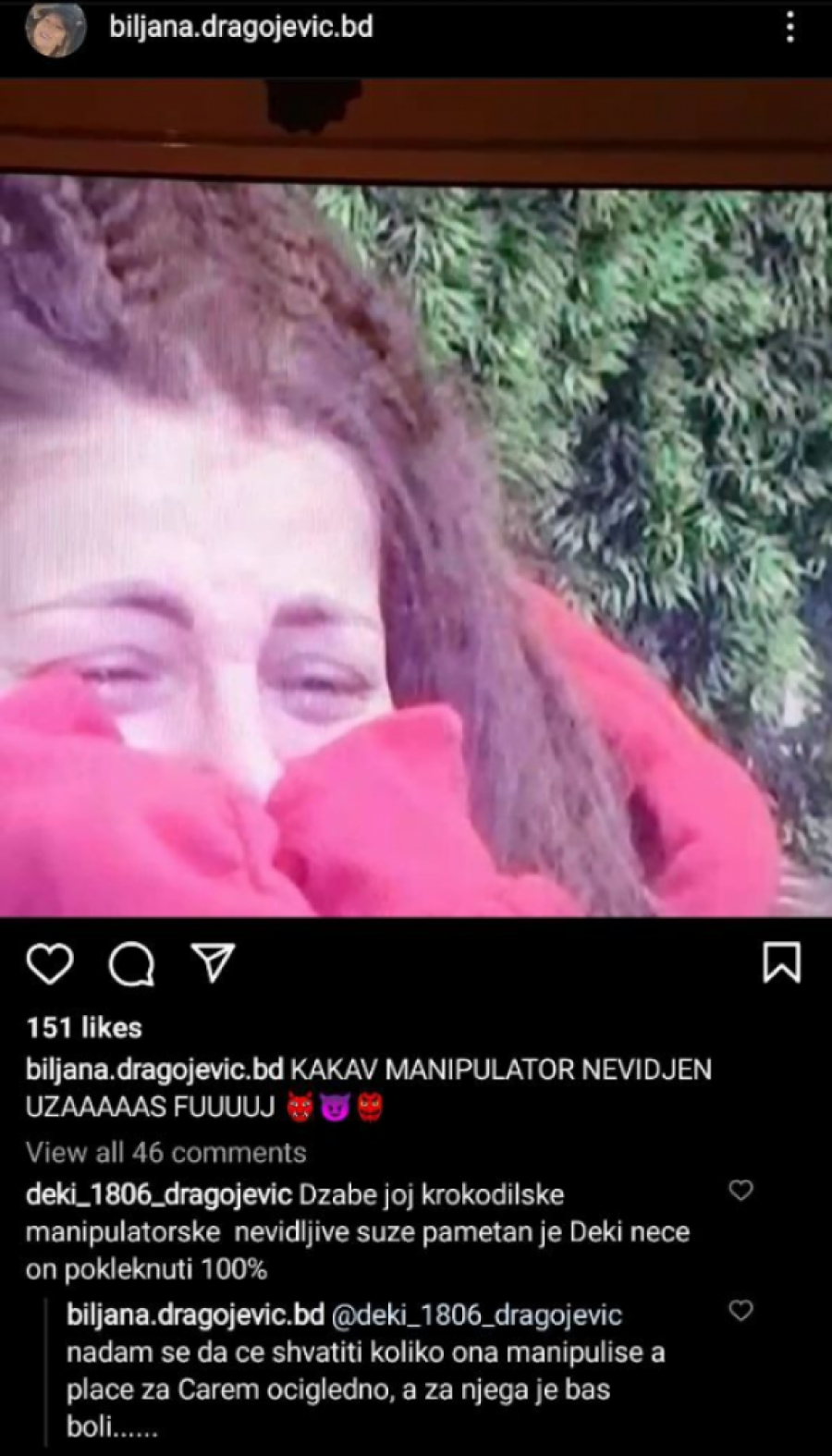 Nakon toga Dejanova majka, Biljana Dragojević, objavila je na svom Instagram nalogu Dalilinu fotografiju kako plače uz vrlo oštar opis iste.
