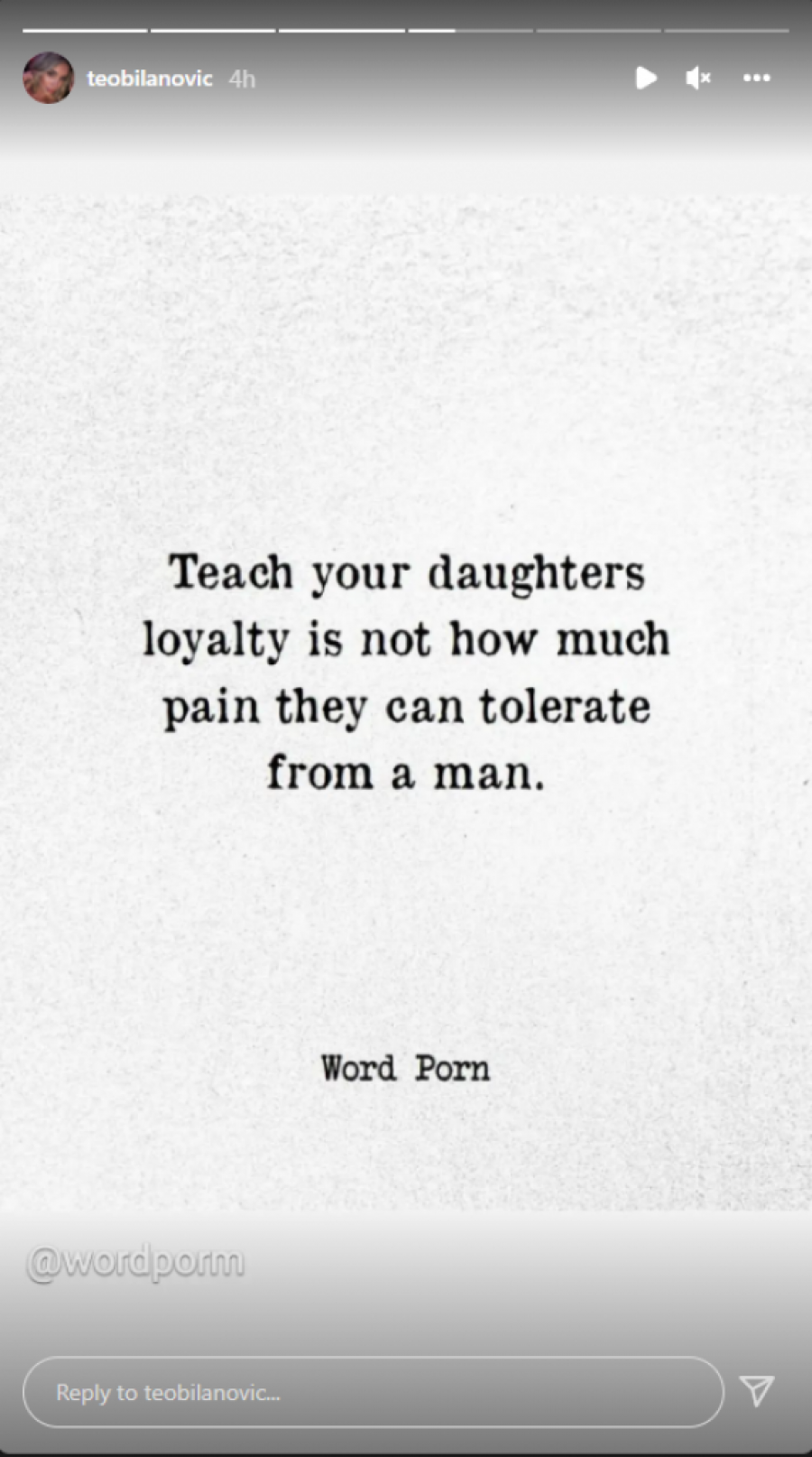 - Naučite svoje ćerke da lojalnost nije koliko bola mogu tolerisati od muškarca - piše u Teodorinoj objavi na storiju.