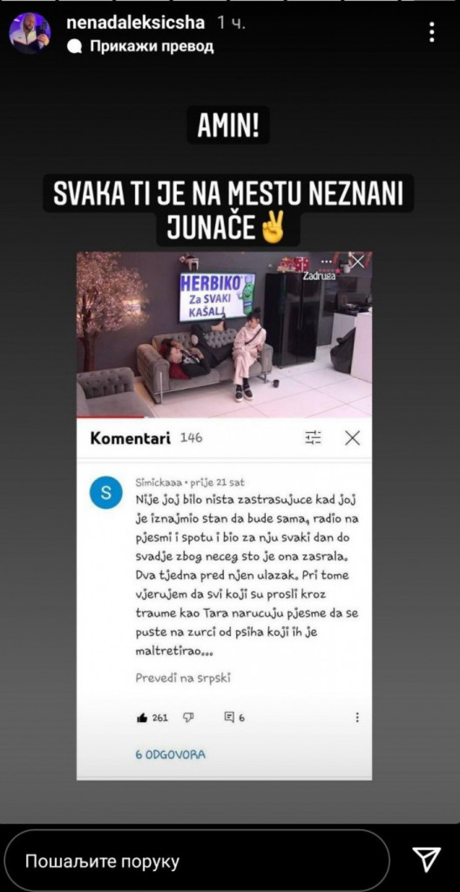 - Nije joj bilo ništa zastrašujuće kad joj je iznajmio stan da bude sama, radio na pesmi i spotu i bio za nju, svaki dan do svađe zbog nečeg što je ona zasr*ala dve nedelje pred nje ulazak. Pirtom, verujem da svi koji su prošli kroz traume kao Tara naručuju pesme da se puste na žurki od psiha koji ih je maltretirao - napisala je jedna osoba, a Ša je to objavio na svom storiju i dodao: