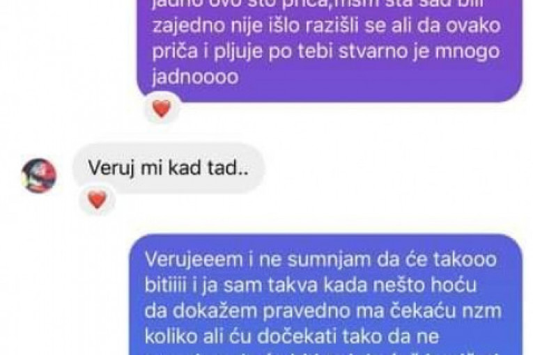 - Koji si ti kralj, a ona blam u tvojoj trenerci, pljuje po tebi kako nema uopšte blama, dobro joj Mateja i rekao da je blam Srbije. Ma ona hoće sebe da opravda tu da ispadne ona svetica u toj vezi da je bila, ma ne sumnjam ti si pametan dečko i veruj mi jedva čekam da dođe tih tvojih pet minuta i da otvoriš sve karte na sto i spustiš je na dno tamo gde joj je i mesto, jer stvarno je jadno ovo što priča, mislim, pšta sad bili zajedno, nije išlo, razišli se, ali da ovako priča i pljuje po tebi, stvarno je mnogo jadno.