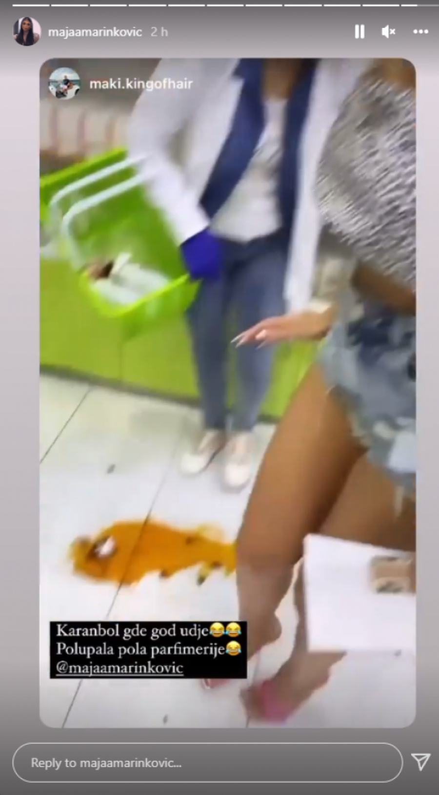 Naime, Maja je uspela da napravila karambol u parfimeriji, što je on zabeležio svojim telefonom i objavio na Instagram profilu. Verovatno je u pitanju samo nezgodna situacija, koja je završila lošim ishodom, ali po Majinom izrazu lica se može zaključiti da se ni ona nije nadala ovome.