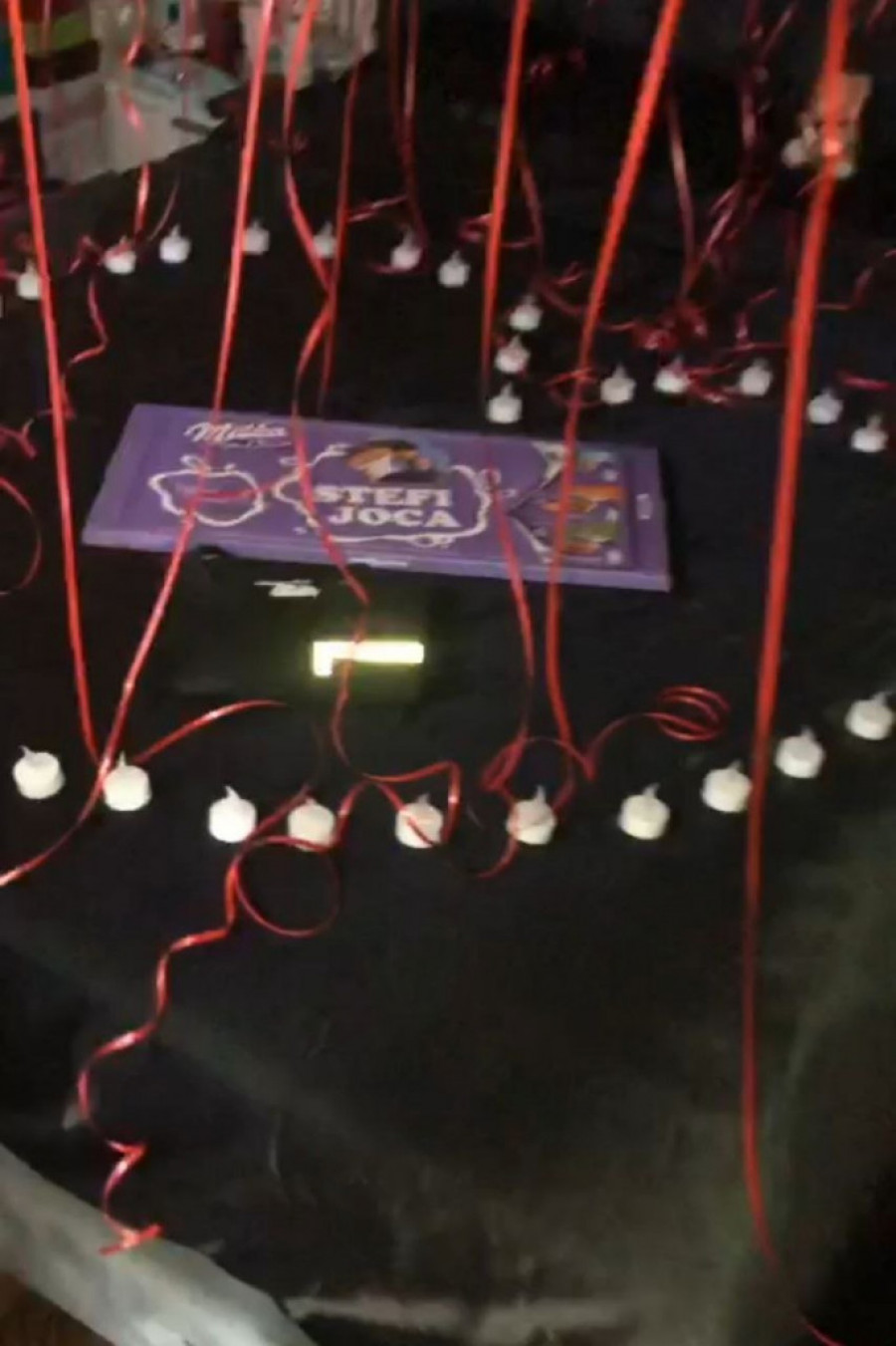 Jovana je sobu ukrasila balonima, svećama dok se na krevetu nalazi velika čokolada sa natpisom "JOCA I STEFI".