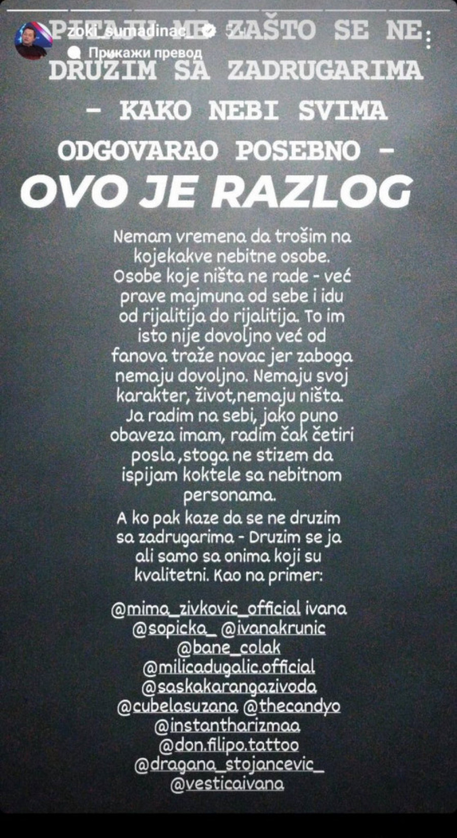 - To im isto nije dovoljno već od fanova traže novac, jer zaboga, nemaju dovoljno. Nemaju svoj karakter, život, nemaju ništa. Ja radim na sebi, jako puno obaveza imam, radim čak četiri posla, stoga ne stižem da ispijam koktele sa nebitnim personama. A ko pak kaže da se ne družim sa zadrugarima - družim se ja, ali samo sa onima koji su kvalitetni, kao na promer Mima Živković, Ivana Šopić, Ivana Krunić, Bane Čolak, Milica Dugalić, Saška Karan... - napisao je Zoran u objavi na Instagramu.