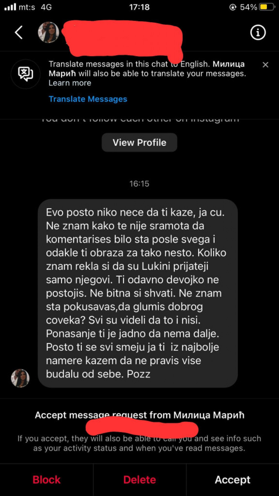 Inače, Milica je u poruci koju je poslala Jovani uputila brojne uvrede, navodeći da je "nebitna", da "ne postoji" i da joj je "ponašanje jadno".