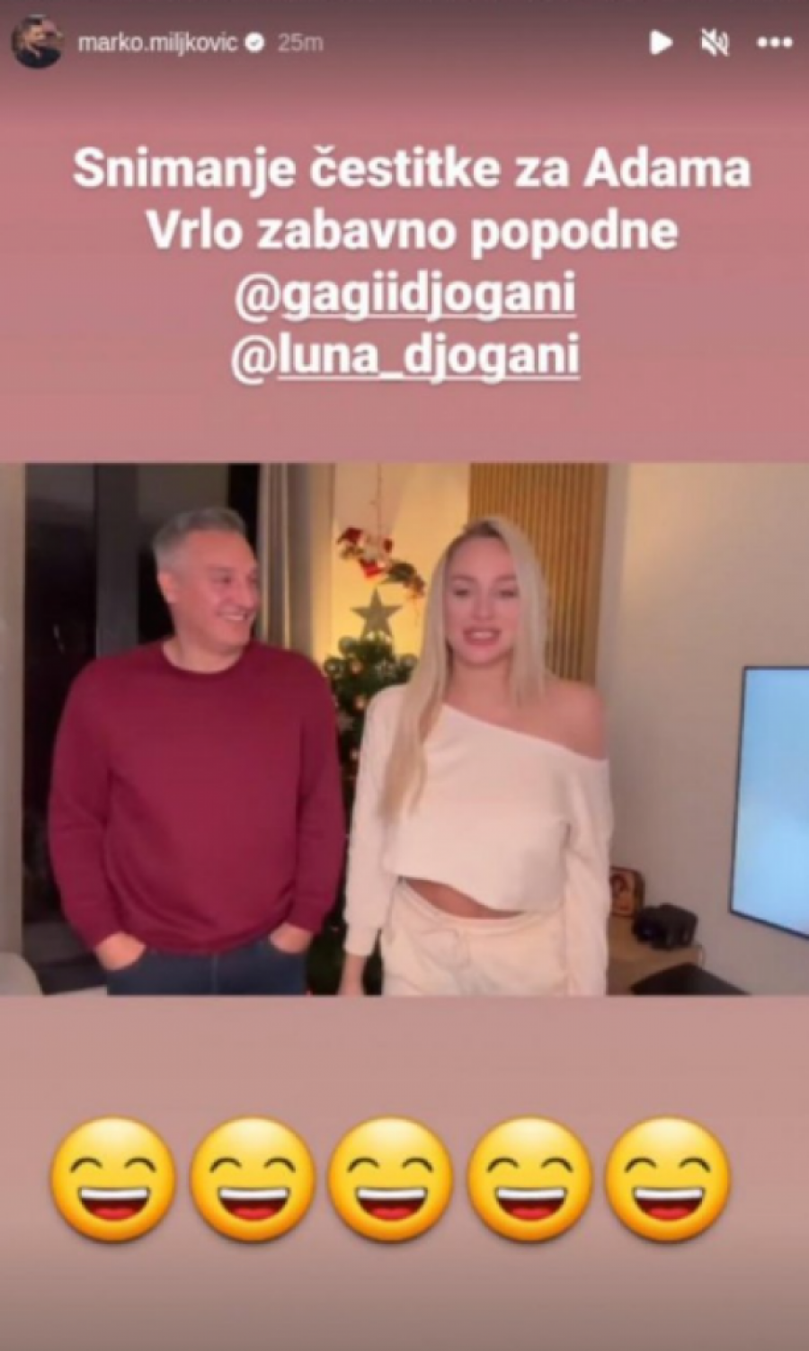 Lunin suprug, Marko Miljković podelio je fotografiju na svom Instagram profilu gde je otkrio da Luna i Gagi Đogani snimaju novogodišnju čestitku za Adama.