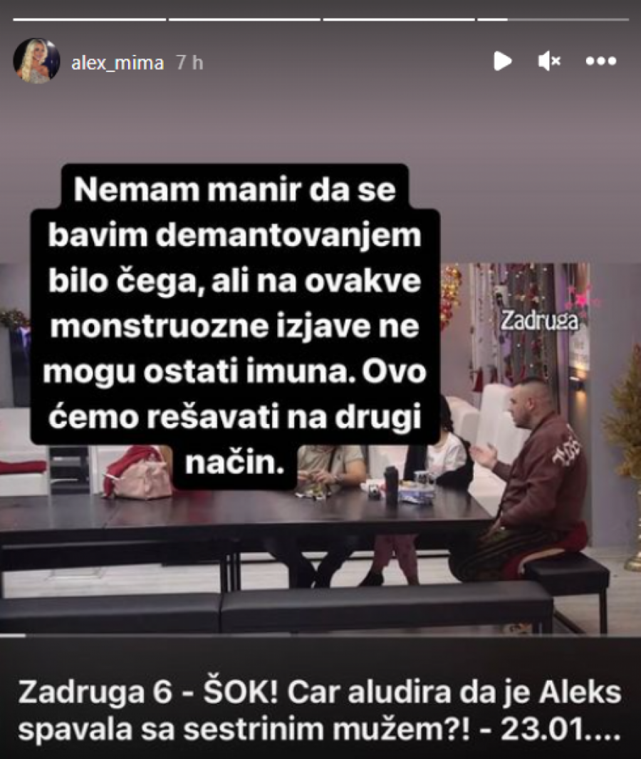 Nakon što je Filip Car izneo tvrdnje da je Aleksandra Nikolić navodno imala vrelu akciju sa mužem rođene sestre Jelene, ona se oglasila na Instagramu i poručila da će se na drugačiji način sa njim.