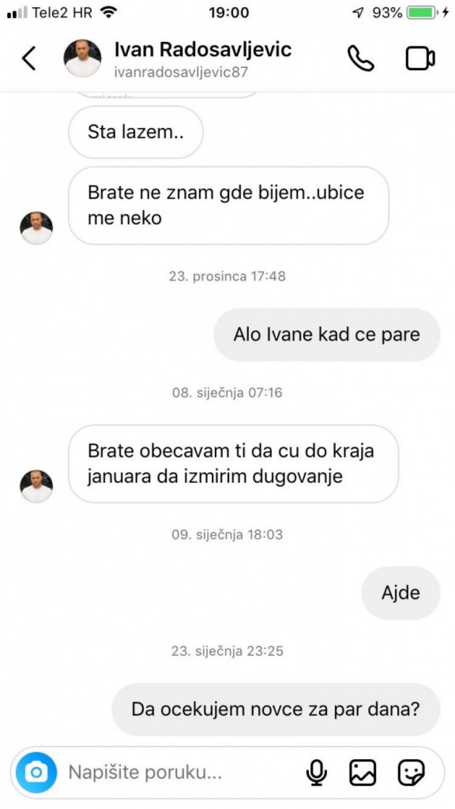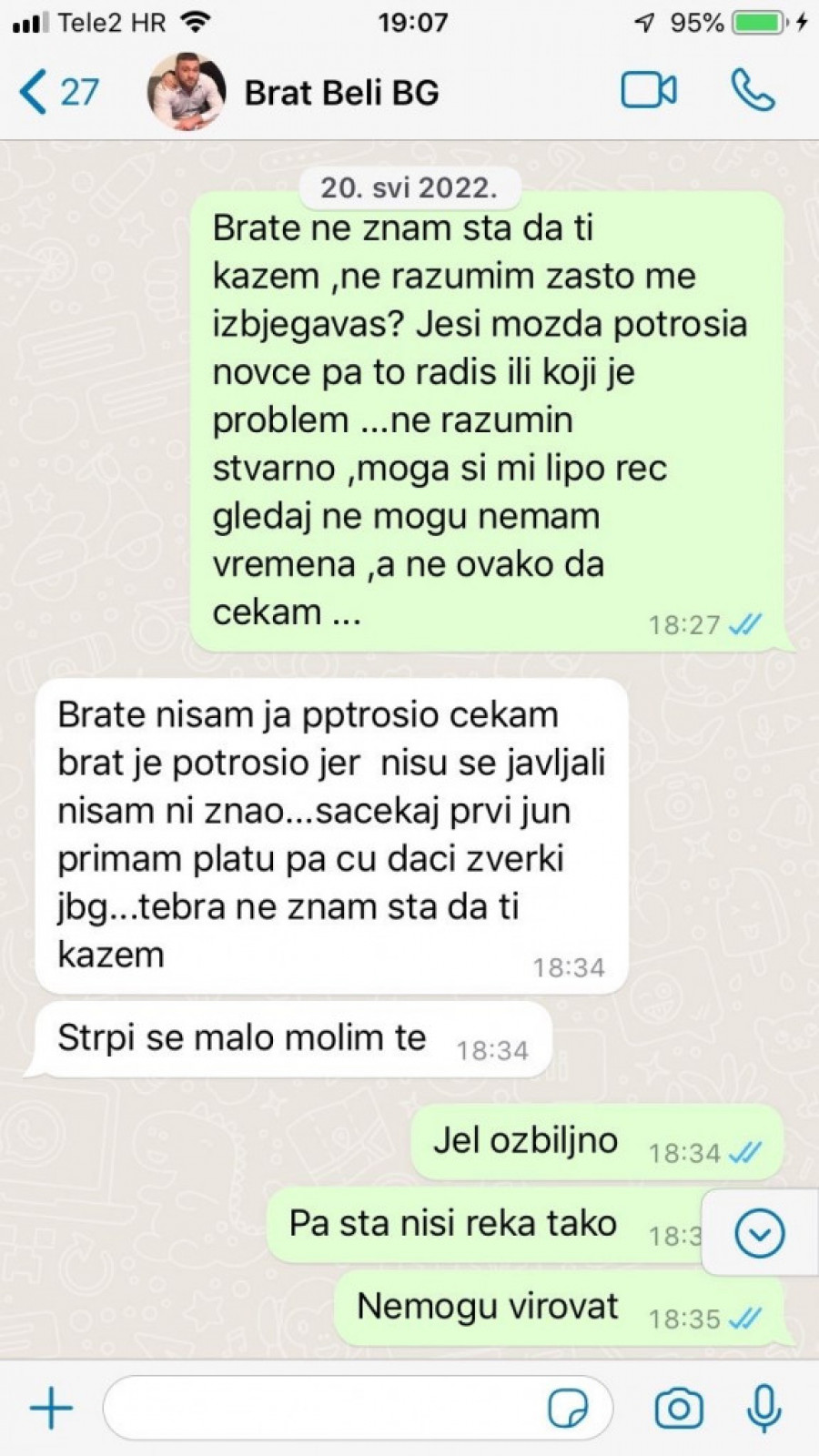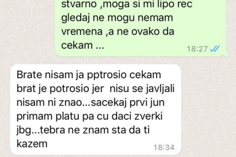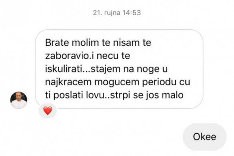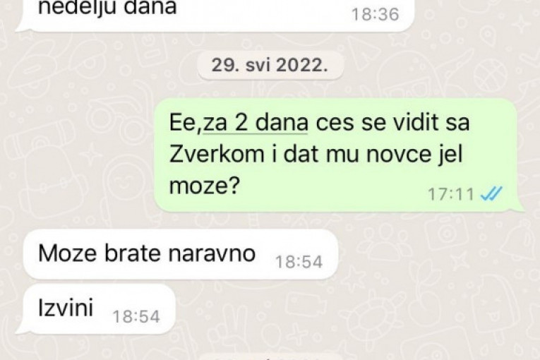 - Nije meni do novca, nego do principa, ja sam se iznenadio. Okej, nije do veliki novac, jeste, neka je i 10 evra, ali to je moj novac, koji sam ti pozajmio i ti nećeš da vratiš, a znaš da si dužan, to mi je strašno, ja ne mogu da verujem u to. Ja sam ga nekoliko puta zvao, pisao mu poruke, nikada nisam dobio novac nazad. Ja stvarno ne želim da ispadne kako ja nekog cinkarim, ali hoću da ljudi znaju da se ne zeznu drugi sa njim. On mi se više ni ne javlja, ja sam mislio da će se opametiti, ali ne, toliko smo vremena proveli zajedno, zamolio me je da mu pomognem, izašao sam mu u susret, da mi ovako vrati, stvarno je sramno - govori Ante za Republiku.