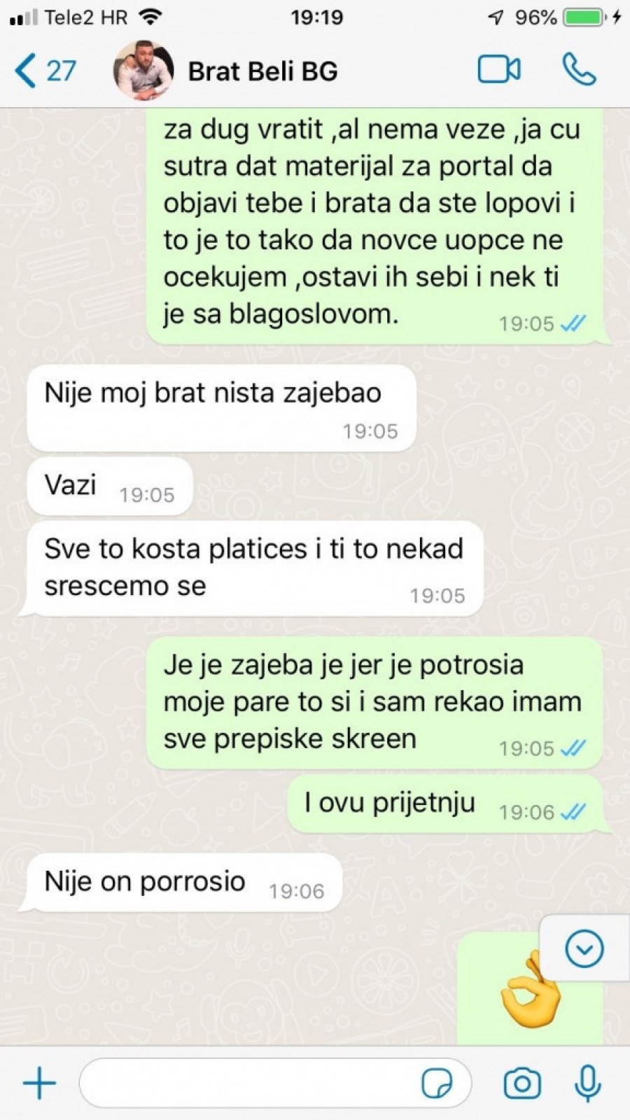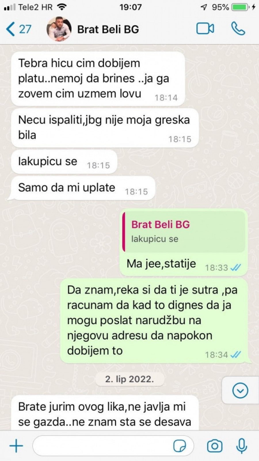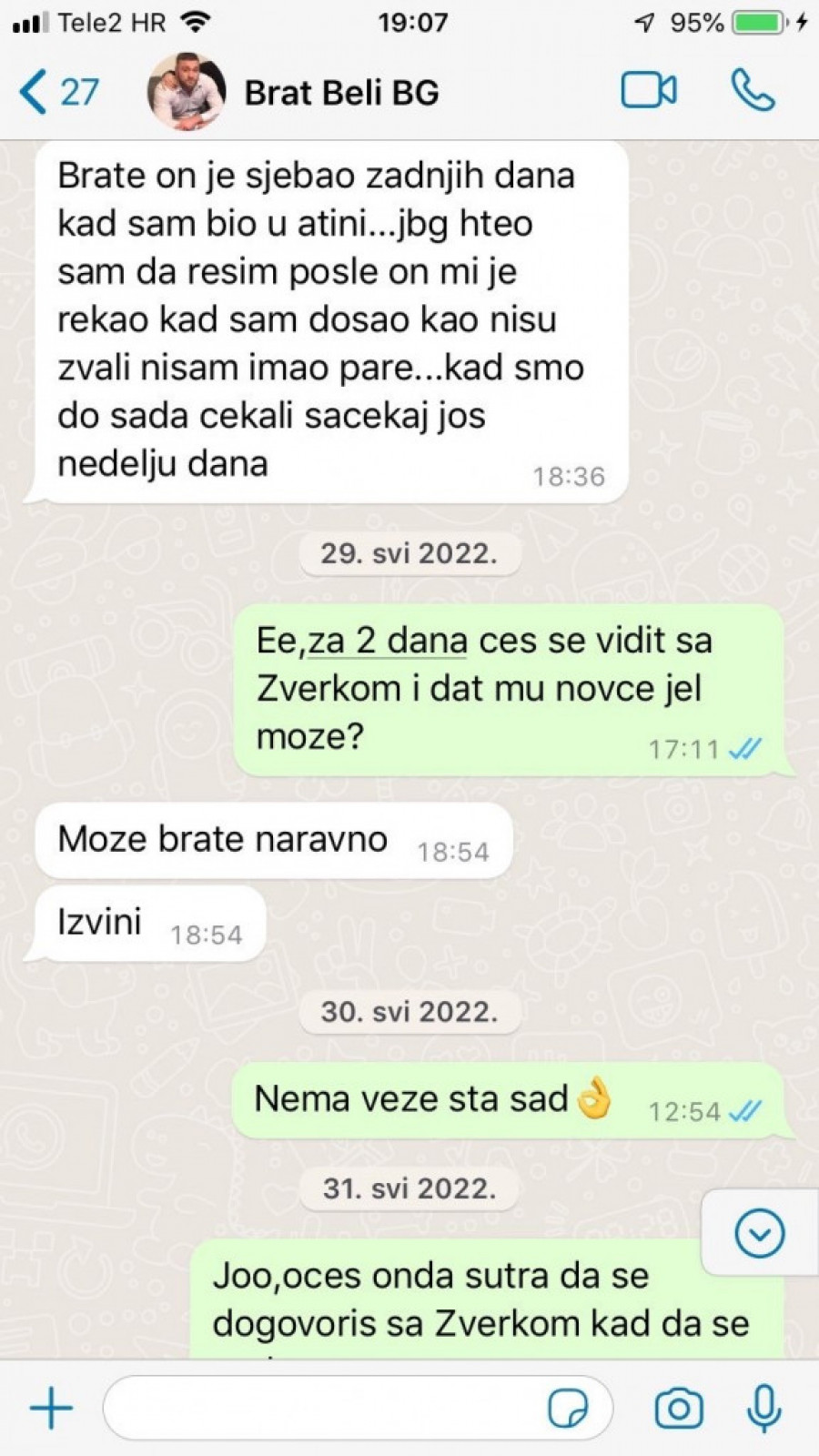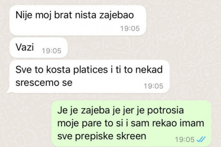 - Nije meni do novca, nego do principa, ja sam se iznenadio. Okej, nije do veliki novac, jeste, neka je i 10 evra, ali to je moj novac, koji sam ti pozajmio i ti nećeš da vratiš, a znaš da si dužan, to mi je strašno, ja ne mogu da verujem u to. Ja sam ga nekoliko puta zvao, pisao mu poruke, nikada nisam dobio novac nazad. Ja stvarno ne želim da ispadne kako ja nekog cinkarim, ali hoću da ljudi znaju da se ne zeznu drugi sa njim. On mi se više ni ne javlja, ja sam mislio da će se opametiti, ali ne, toliko smo vremena proveli zajedno, zamolio me je da mu pomognem, izašao sam mu u susret, da mi ovako vrati, stvarno je sramno - govori Ante za Republiku.