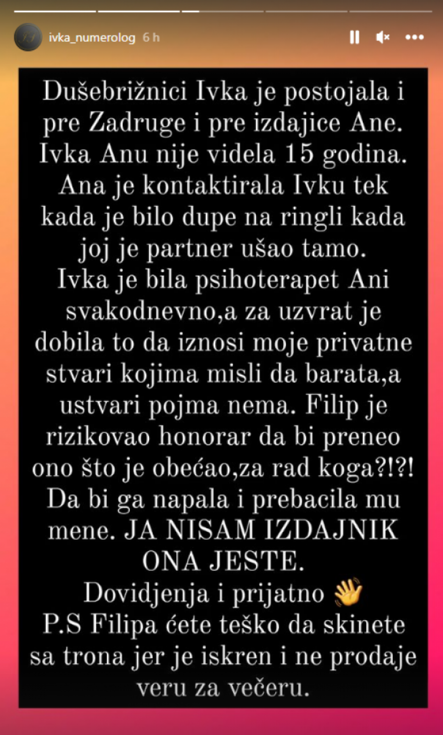 - Dušebrižnici Ivka je postojala i pre Zadruge i pre izdajice Ane. Ivka Anu nije videla 15 godina. Ana je kontaktirala Ivku tek kada je bilo d*pe na ringli kada joj je partner ušao tamo. Ivka je bila psihoterapeut Ani svakodnevno, a za uzvrat je dobila to da iznosi moje privatne stvari kojima misli da barata, a ustvari pojma nema. Filip je rizikovao honorar da bi preneo ono što je obećao zarad koga?! Da bi ga napala i prebacila mu mene. Ja nisam izdajnik ona jeste. Doviđenja i prijatno! Filip ćete teško da skinete sa trona, jer je iskren i ne prodaje veru za večeru - napisala je Ivka.