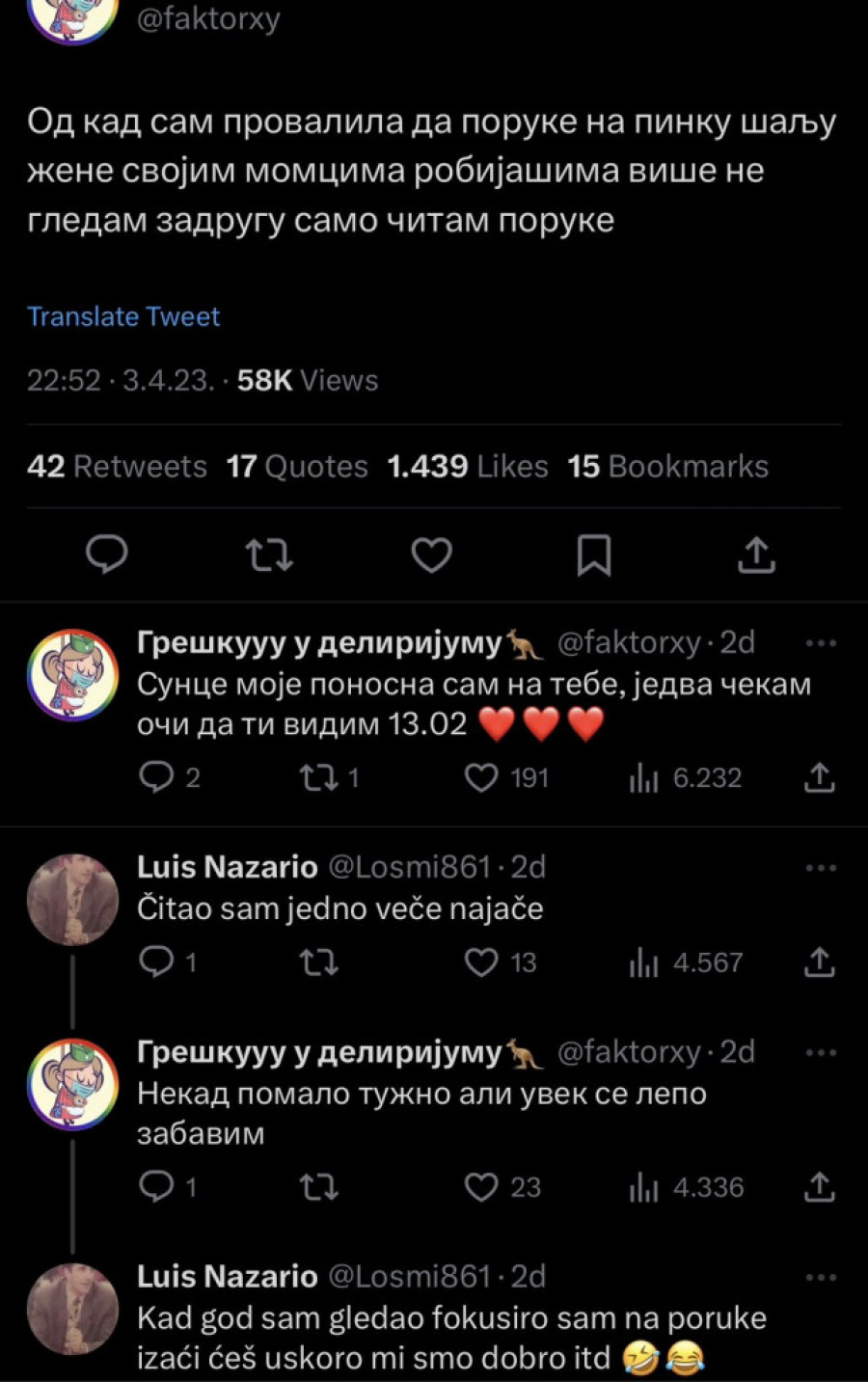 Ove poruke primetili su i korisnici Tvitera. "Otkad sam provalila da poruke na Pinku šalju žene svojim momcima robijašima, više ne gledam Zadrugu, samo čitam poruke" napisala je jedna korisnica i citirala poruku: "Sunce moje, ponosna sam na tebe, jedva čekam oči da ti vidim". I drugi korisnici su se nadovezali i dodali da su primetili isto.