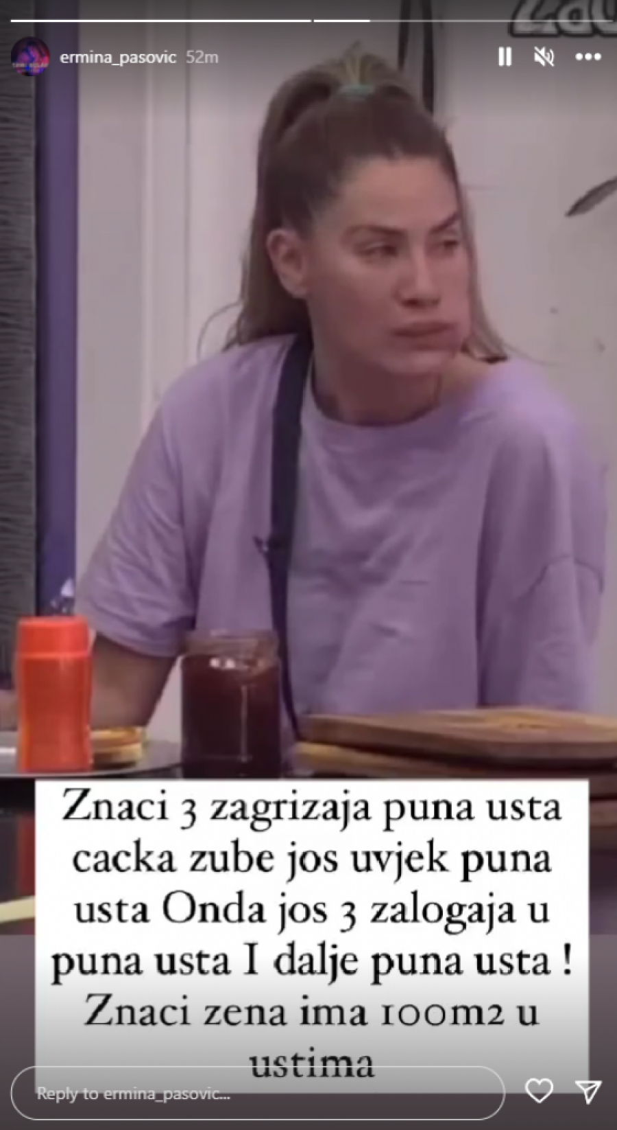 - Znači, 3 zagrizaja, puna usta, onda čačka zube, pa još 3 zalogaja... Žena ima 100m2 u ustima - napisala je Ermina.